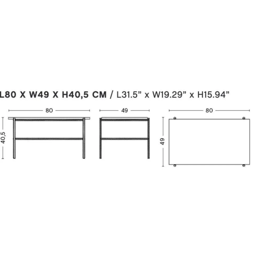 Der Rebar Couchtisch 80x49cm hat ein Gewicht von 27,5 kg. Die Höhe beträgt 40,5 cm. Das Modell ist 80 cm lang und 49 cm breit. Aus derselben Kollektion gibt es auch Beistelltische in anderen Größen und mit runden Tischplatten.