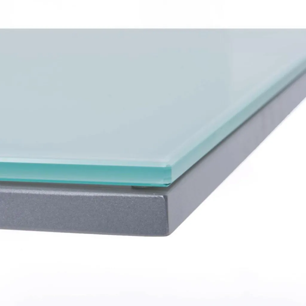 Eine 8 mm dünne Tischplatte aus Sicherheitsglas wird getragen von einem filigranen Gestell aus pulverbeschichtetem Stahl in luna-silber, das halbseitig offen ist. Sie ist erhältlich in den Farben Weiß, Rot und Mocca. Um die Tiefenwirkung der Farbe noch zusätzlich zu intensivieren, ist die Glasplatte auf der Unterseite mit farbigem Siebdruck lackiert.