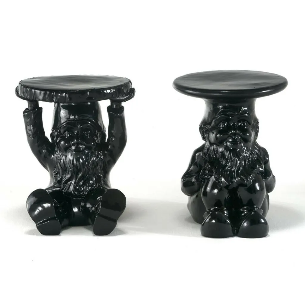 Napoleon, Attila und Saint-Esprit sind die Namensgeber des Gnomes/Zwerg Beistelltisches.Eine niedliche Zwergenfigur dient bei den Varianten Napoleon und Attila als Basis. Bei der Attila-Version hält der Zwerg die Tischplatte mit erhobenen Händen, bei der Napoleon-Version sitzt sie auf dem Kopf. Der Saint-Esprit-Tisch ähnelt einem Baumstamm. Es gibt den Gnomes/Zwerg Beistelltisch einfarbig oder bunt. Man kann den Tisch als nützliche Ablage und als Hocker verwenden. Doch auch als Dekorationsobjekt wird er gerne eingesetzt. Er besteht aus thermoplastischem Technopolymer. Wird der Gnomes/Zwerg Beistelltisch einmal schmutzig oder nass, kann er mit einem weichen Tuch abgewischt werden.