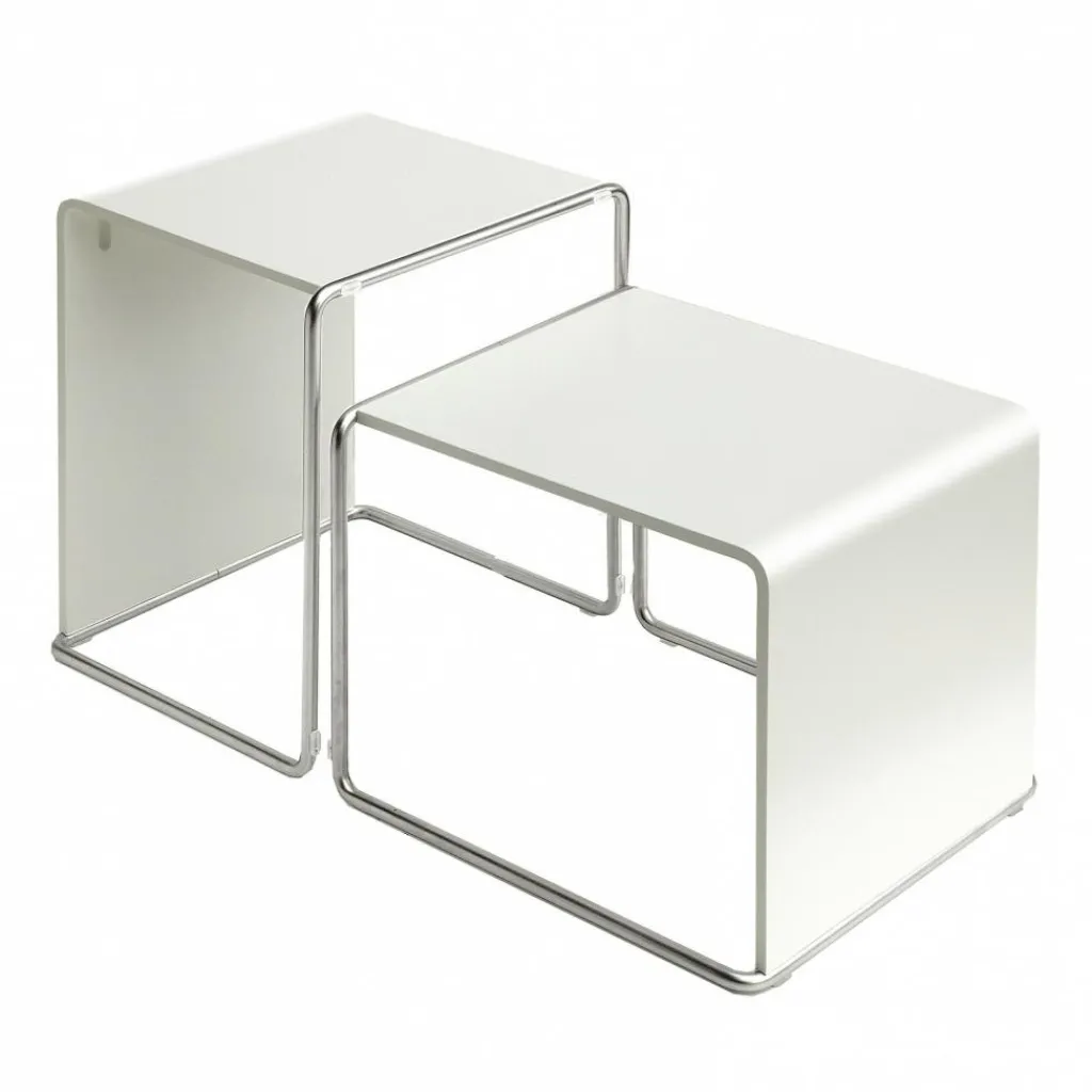 Das Gestell der Ueno Beistelltische/Hocker besteht aus sandgestrahltem Edelstahl, die Tischplatte/Sitz aus Multiplex.