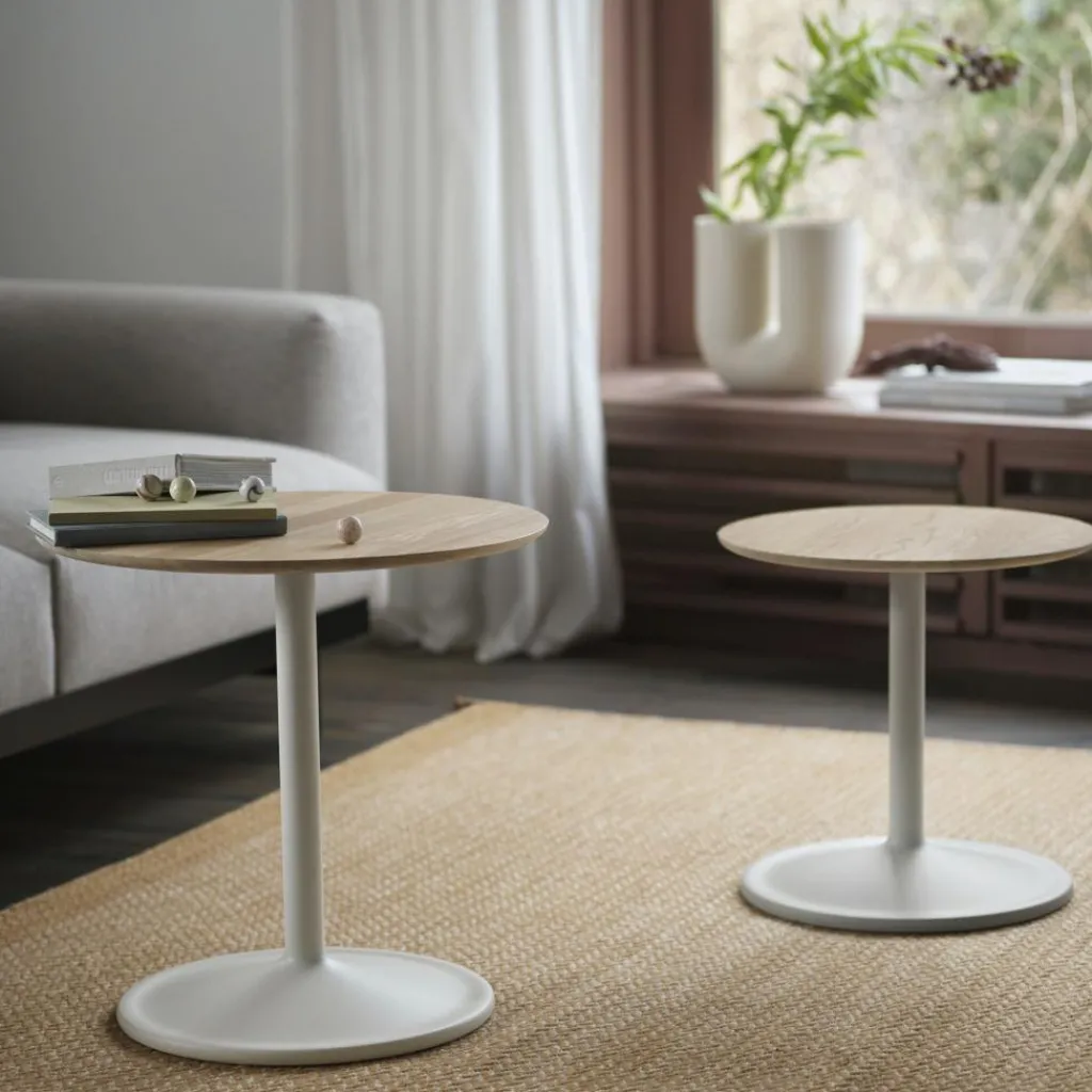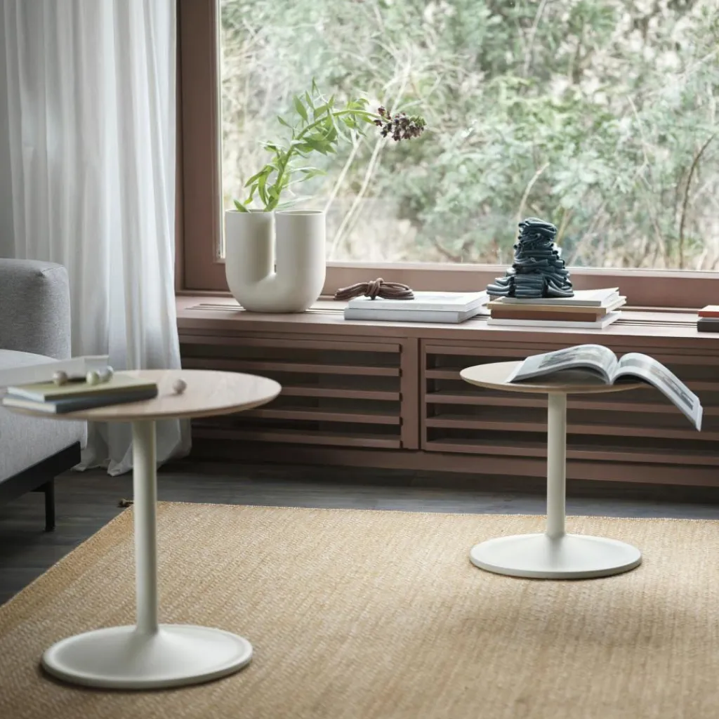 Mit seinen sanften Formen und der perfekten Symmetrie wird der Soft Beistelltisch H 40cm Ø 41cm in jedem Setting zum zurückhaltenden Möbelstück. Er ist in privaten Wohnzimmern neben der Sofalandschaft zu finden, wo er als Abstellfläche für Gläser, Zeitschriften und vieles mehr dient. Der kleine Tisch bereichert auch den Arbeitsplatz, egal ob im Home-Office oder im Büro. Er fügt sich harmonisch in ein Wartezimmer oder eine Hotellobby ein. Da sich das Design auf die wichtigsten Elemente beschränkt, kann er sowohl mit modernen als auch mit traditionellen Möbeln kombiniert werden. Das Gestell besteht aus pulverbeschichtetem Aluminium. Der Designer verwendet zu 97 % recyceltes Material. Die Basis besteht aus einem runden Sockel und einem Rohr. Die Tischplatte besteht aus hochwertiger mitteldichter Holzfaserplatte oder Eichenholz. Das Modell ist in verschiedenen Farben erhältlich.