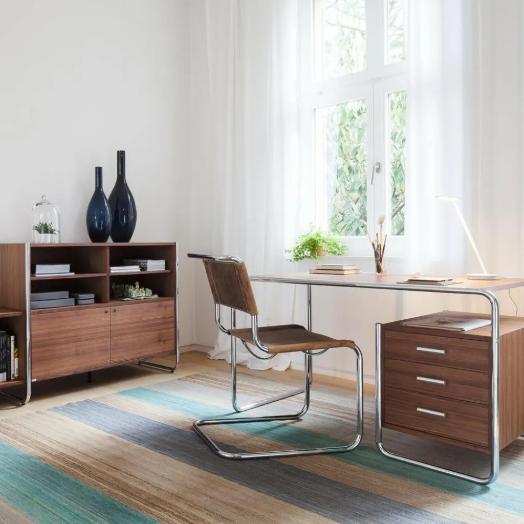 Den S 285/2 Schreibtisch gibt es in verschiedenen Ausführungen, sodass für jedes Arbeitszimmer das passende Modelle erhältlich ist. Perfekt dazu passen die Freischwinger S 34 von Thonet im Bauhaus Stil mit ihren glänzendem Chromrahmen.