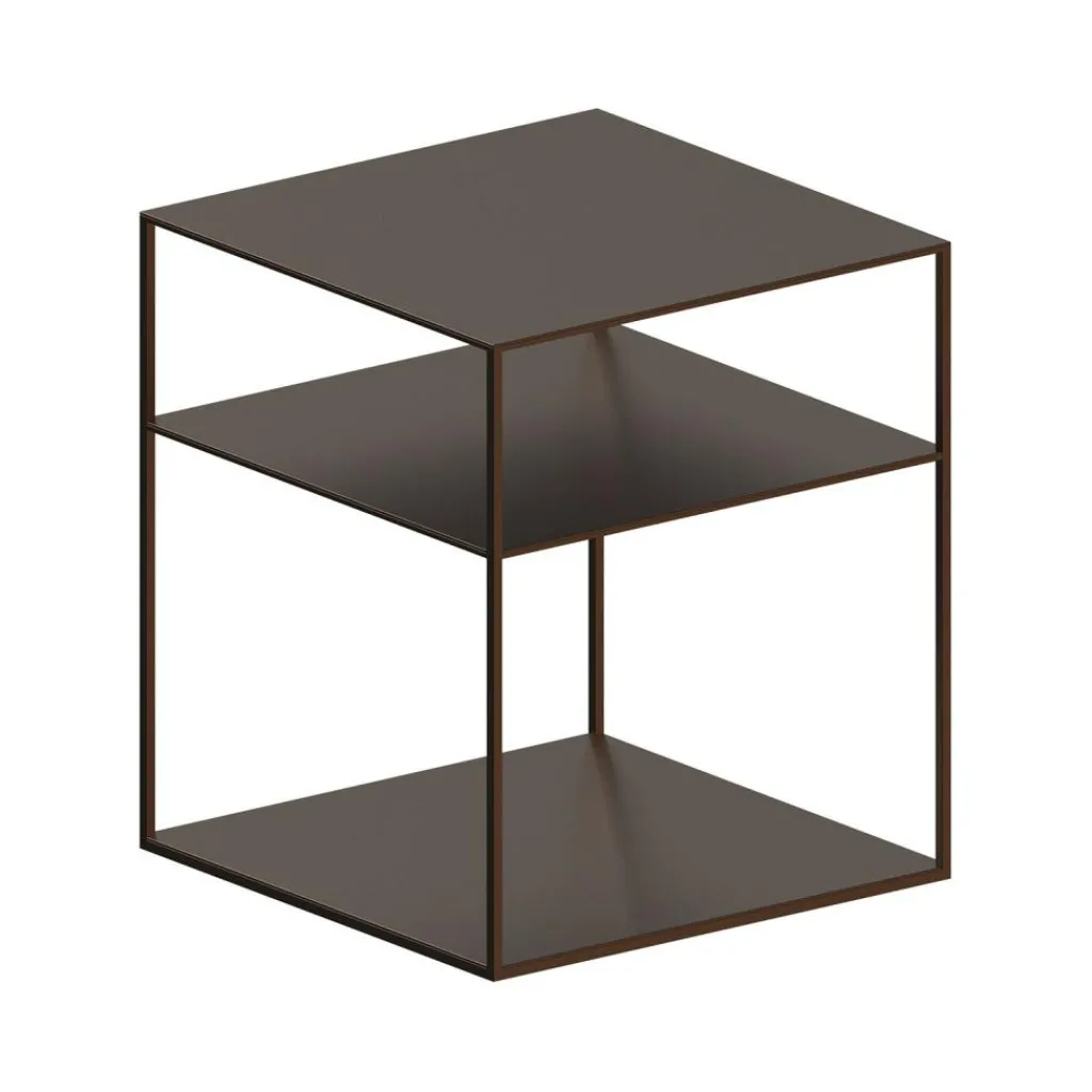 Eine formschöne Gitterkonstruktion mit dünnen Rahmenelementen und abgerundeten Kanten bildet das Grundgerüst dieses minimalistischen Designmöbels, das zusätzlich zu seiner Tischplatte noch weitere Abstellflächen aufweist. Im oberen Drittel besitzt der Slim Irony Triplet Beistelltisch 40x40cm eine quadratische Ablage, die sich für lose Blätter oder Zeitungen eignet. Der Boden besteht aus einer weiteren Platte und kann ebenfalls als Abstellfläche verwendet werden. Sie lässt sich einfach herausnehmen, während die beiden Platten darüber fest mit dem Gestell verschweißt sind. Aus Stahl gefertigt, zeichnet sich der Slim Irony Triplet Beistelltisch 40x40cm durch eine gute Belastbarkeit aus. Mit seiner epoxidlackierten Oberfläche passt er in eine Galerie, einen Laden oder ins Wohnzimmer.