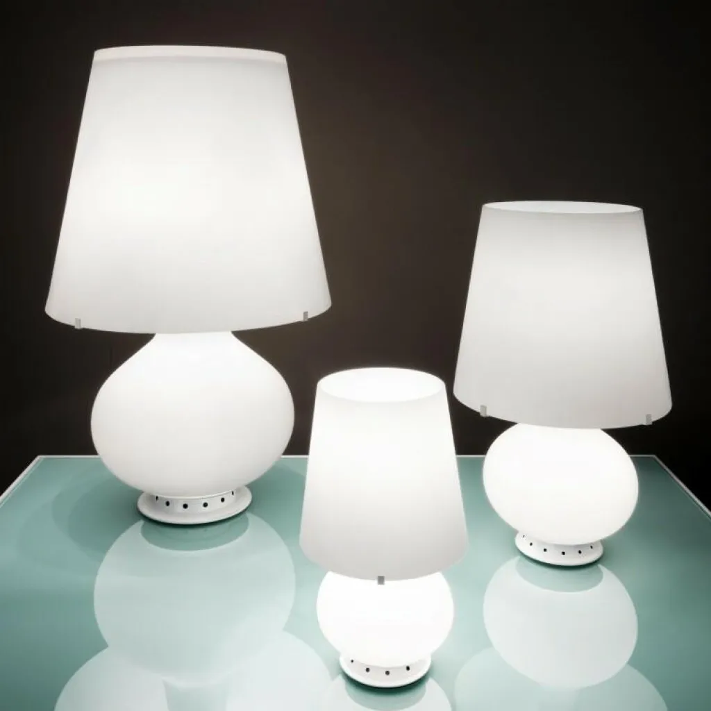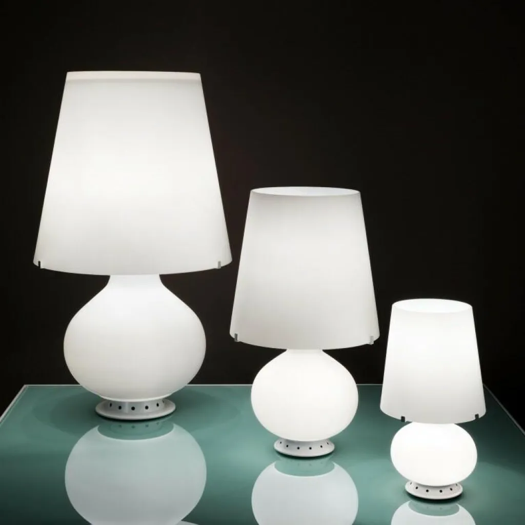 Die Fontana Tischleuchte S ist einzigartig: Sowohl im Sockel als auch im Leuchtenschirm sind Leuchtmittel verteilt. Betätigt man den Schalter, der im Kabel integriert ist, erstrahlen beide Elemente in sphärischem Licht. Man kann aber auch nur die Leuchtmittel in der Basis oder im Schirm einschalten. Der Rahmen des Leuchtenschirms wird aus lackiertem Metall gemacht. Für den Diffusor und die Basis verwendet der Designer mundgeblasenes, opales Muranoglas. Sie lassen blendfreies Licht in alle Richtungen durch. Der Sockel hat eine harmonische bauchige Form und der Schirm ist klassisch konisch geformt. Für die Fontana Tischleuchte S gibt es viele Einsatzmöglichkeiten: Sie macht auf dem Arbeitsplatz eine ebenso gute Figur wie auf einem Regal oder Fensterbrett.