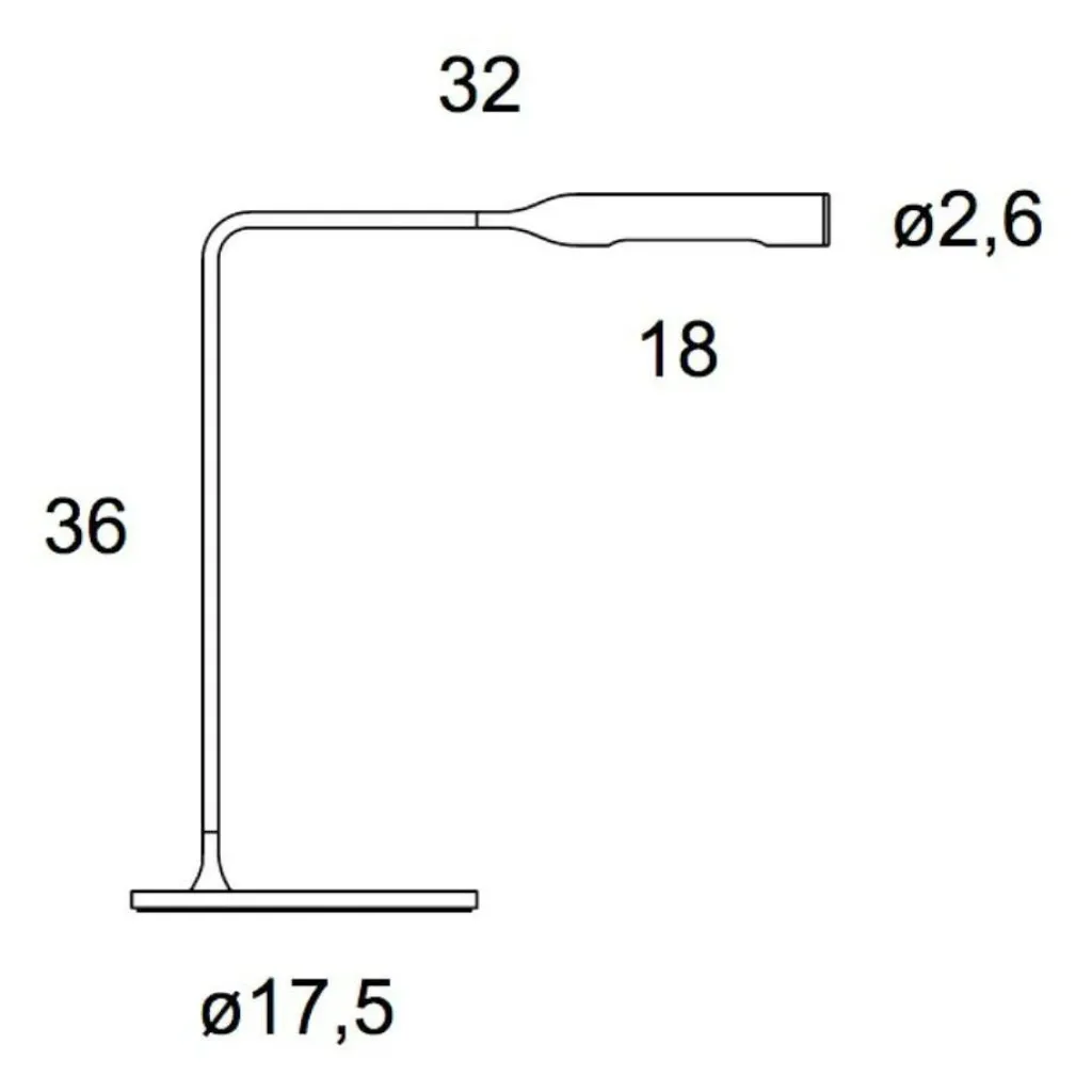 Die Flo Bedside LED Nachttischleuchte hat eine Höhe von 36 cm. Die Breite beträgt 32 cm. Der Schirm hat einen Durchmesser von 2,6 cm. Er ist 18 cm lang. Der Fuß hat einen Durchmesser von 17,5 cm. Die integrierten Leuchtmittel geben warmweißes Licht nach unten ab.
