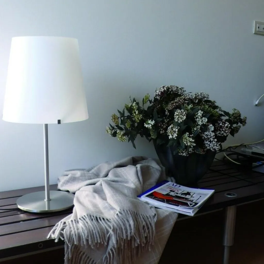 Schon seit 1954 verbreitet die 3247TA Tischleuchte H46cm italienisches Flair in den Raum. Man kann sie auf dem Schreibtisch im Homeoffice oder im Büro platzieren, am Nachttisch oder auf einem Regal verwendet. An jedem Einsatzort verbreitet sie warmes Licht. Es strahlt durch den opalen Diffusor aus mundgeblasenem Glas. Der konisch geformte Schirm leitet das Licht auch nach unten weiter. Das schlichte Gestell besteht aus gebürstetem, vernickeltem Metall. Die Basis ist eine runde Scheibe. Aus ihrer Mitte führt ein Stab zum Leuchtenschirm. Die 3247TA Tischleuchte H46cm passt sich jeder Stimmung an: Man kann die Helligkeit nämlich mit einem Dimmer stufenlos einstellen. Er ist in das schwarze Kabel integriert.