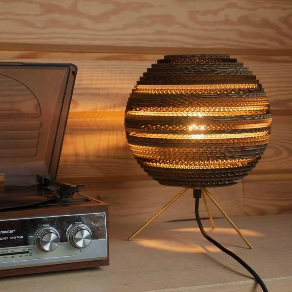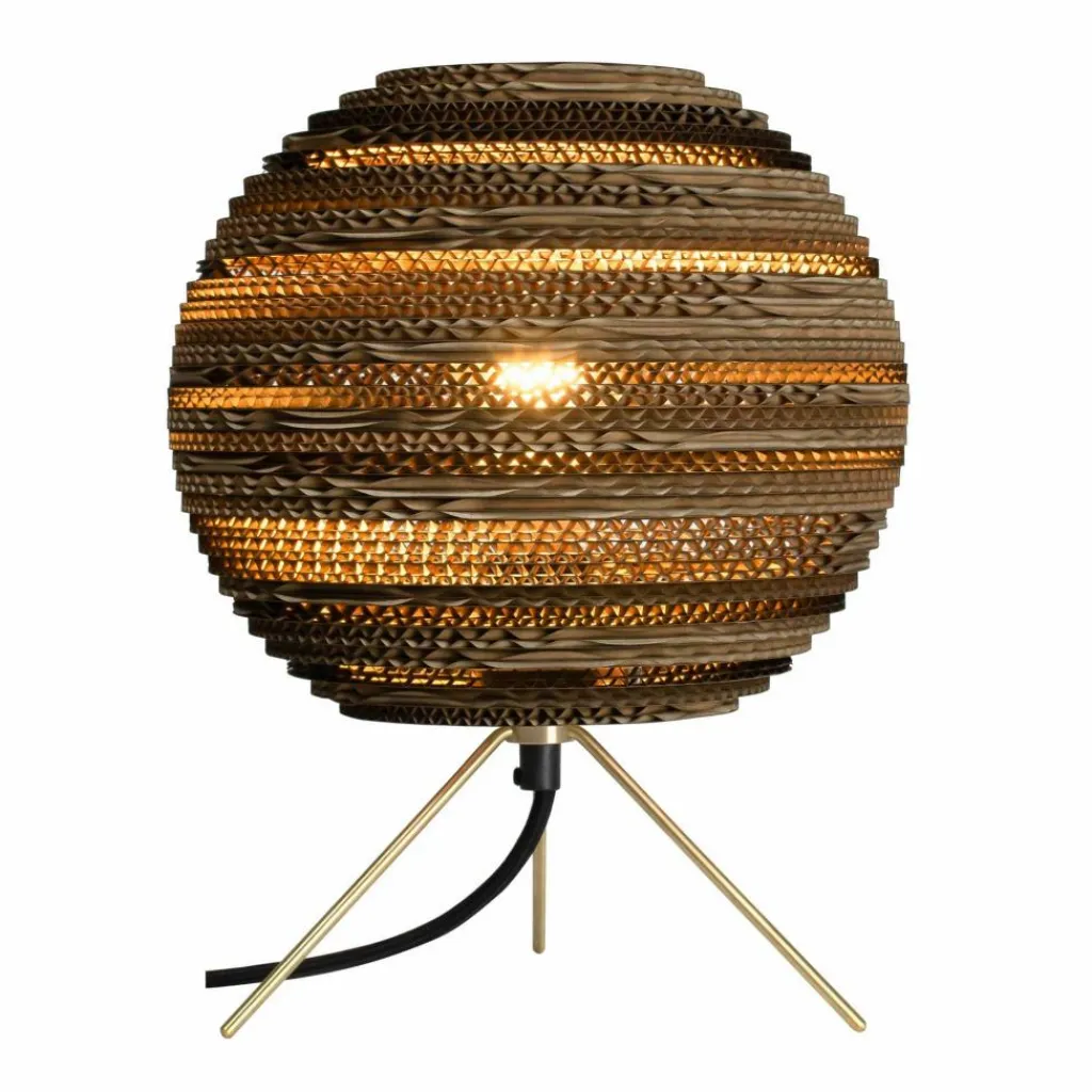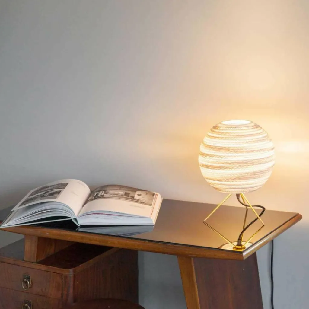 Die Moon Tischleuchte gehört zur Serie Scraplights, die bewusst mit Licht und Schatten spielt. Die Kollektion ist nachhaltig produziert. Der Leuchtenschirm der Moon Tischleuchte besteht aus recyceltem Karton. Er wird präzise in die richtige Form geschnitten. Viele Schichten Karton werden so übereinandergelegt, dass auf der Oberfläche ein faszinierendes Muster entsteht. Schaltet man die Moon Tischleuchte ein, dringt Licht durch den semi-transparenten Schirm in den Raum. Es tritt auch oben und unten aus dem Modell aus. Die Designer entscheiden sich für ein Gestell aus Messing. Drei weit ausgestellte dünne Beine sichern festen Stand. Man kann die Moon Tischleuchte in verschiedenen Farben bestellen.