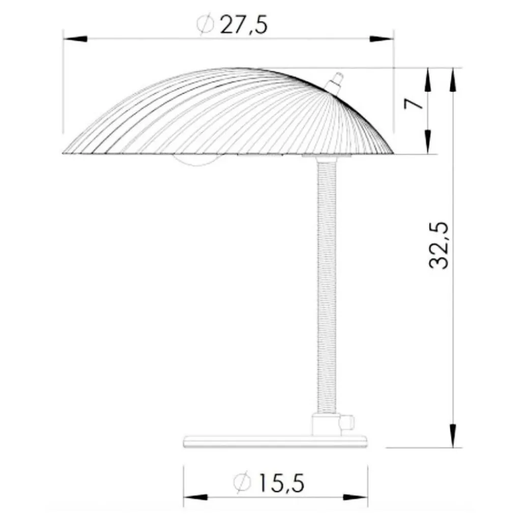 Die elegante Tischleuchte hat die Maße 32,5 x 27,5 cm und bringt 2,4 kg auf die Waage. Ihr Schirm und Fuß sind aus hochwertigem Messing gefertigt. Das Gestell besteht aus mit Stoff bezogenem Rattan und das Kabel ist ebenfalls messingfarben.