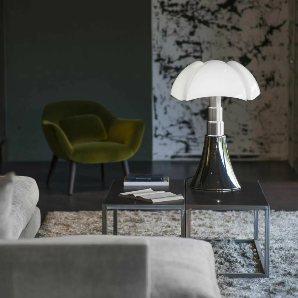 Die technische Raffinesse der Pipistrello LED Tischleuchte dimmbar war 1965 zum Zeitpunkt der Entwicklung einzigartig. Ein Teleskopgestänge aus robustem Edelstahl erlaubt die Verstellung in der Höhe um 20 cm und verändert damit den nach unten fallenden Lichtkegel. Mithilfe des am Kabel integrierten Dimmers können Sie die Helligkeit stufenlos regeln. Der Fuß aus Edelstahl ist in vielen verschiedenen Farben erhältlich, von denen einige matt und andere glänzend sind. Diese Kombination aus schönem Design und hochwertiger Technik, die vor über 50 Jahren neue Maßstäbe setzte, braucht auch im neuen Jahrhundert keinen Vergleich zu scheuen.