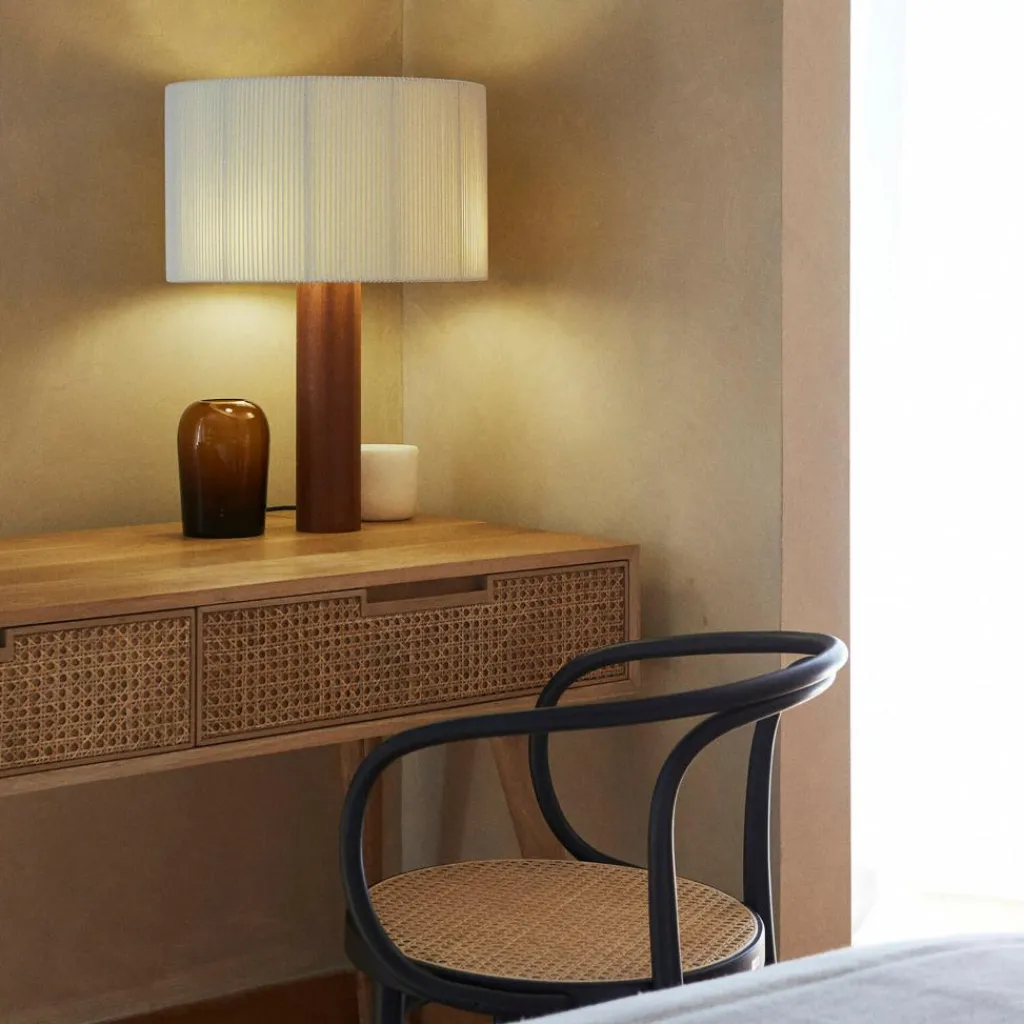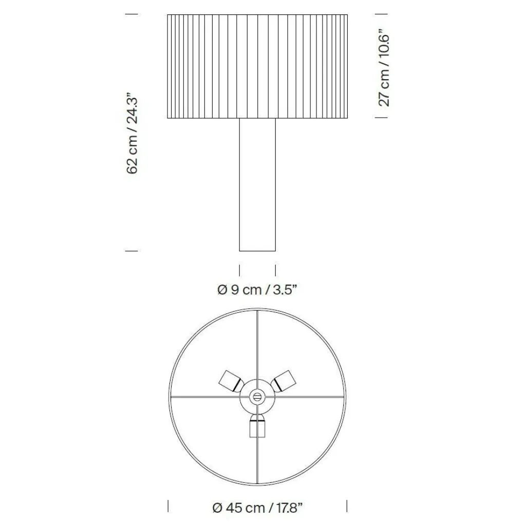 Ein zentraler Zylinder aus Holz bildet den Fuß dieser Leuchte. Er hält den Schirm und ihre drei Glühbirnen. Durch diese Konstruktion fällt das Licht in einem großzügigen, kreisförmigen Kegel auf die angestrahlte Fläche. Die feinen Bänder am oberen und unteren Rand des Leuchtenschirms erzeugen interessante Licht- und Schatteneffekte.