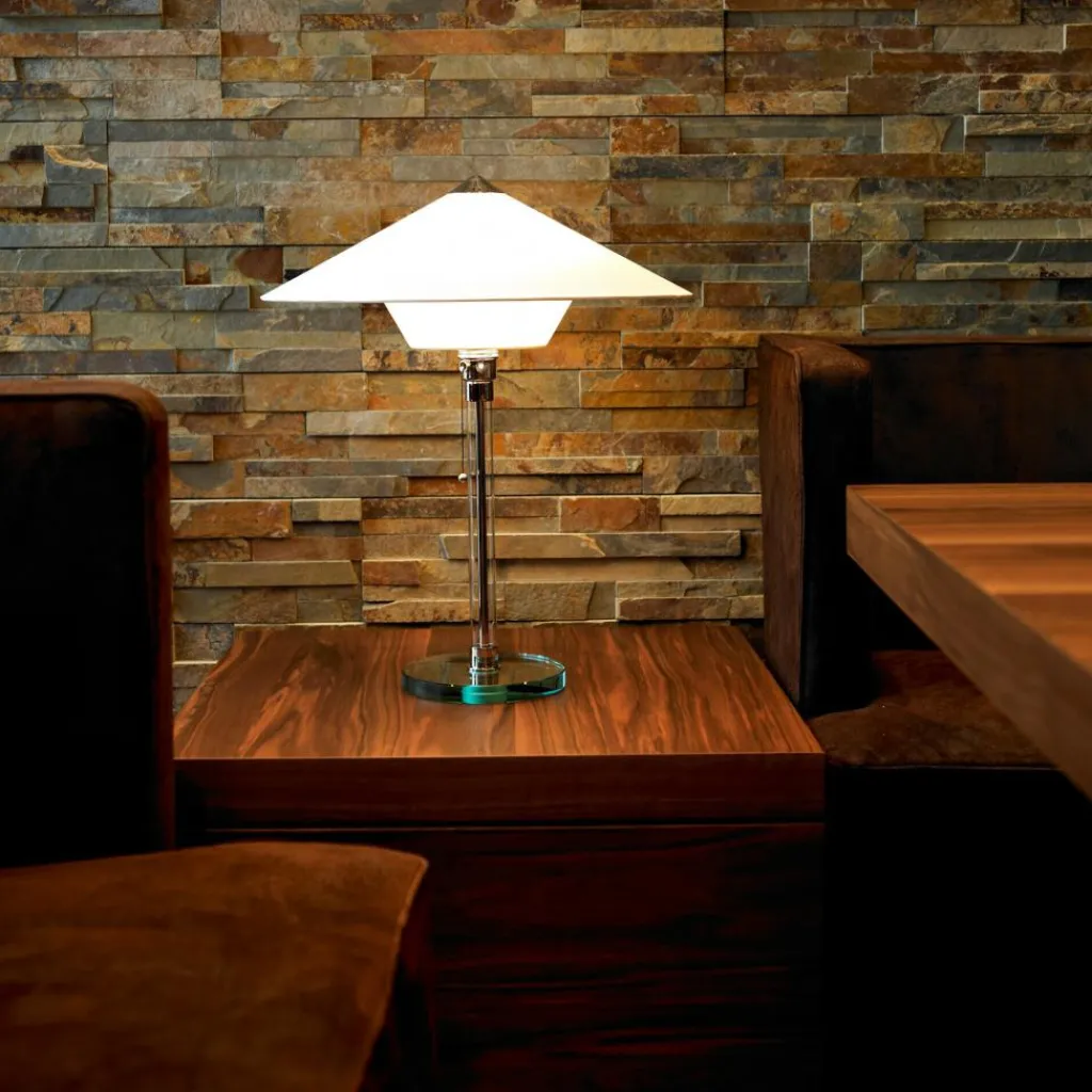 Ein Kartonschirm, der mit einem edlen Chintz-Stoff bezogen ist, bildet den Kopf dieser Designleuchte. Er gibt durch seine durchscheinende Oberfläche einen sanften Lichtschimmer ab und richtet Licht dank seiner konischen Form nach unten, wo es durch den Diffusor blendfrei und zu einem weichen Lichtkegel geformt auf die Tischoberfläche trifft. Eingeschaltet wird die Wagenfeld WG 28 Tischleuchte anhand eines Zugschalters mit zierlicher Kugel unter dem Leuchtenkopf. Elegante Hingucker bilden die gläserne Fußscheibe sowie der mit Glas ummantelte Leuchtenschaft. Die konstruktiven Details, darunter auch die obere Befestigung des Leuchtenschirms, sind aus vernickeltem Metall gefertigt. Unter Bedacht auf regionale Produktion und kurze Transportwege zeichnet sich die Wagenfeld WG 28 Tischleuchte als nachhaltiges Designstück aus. Sie passt in eine Lounge, in ein Designhotel sowie ins Wohnzimmer daheim.