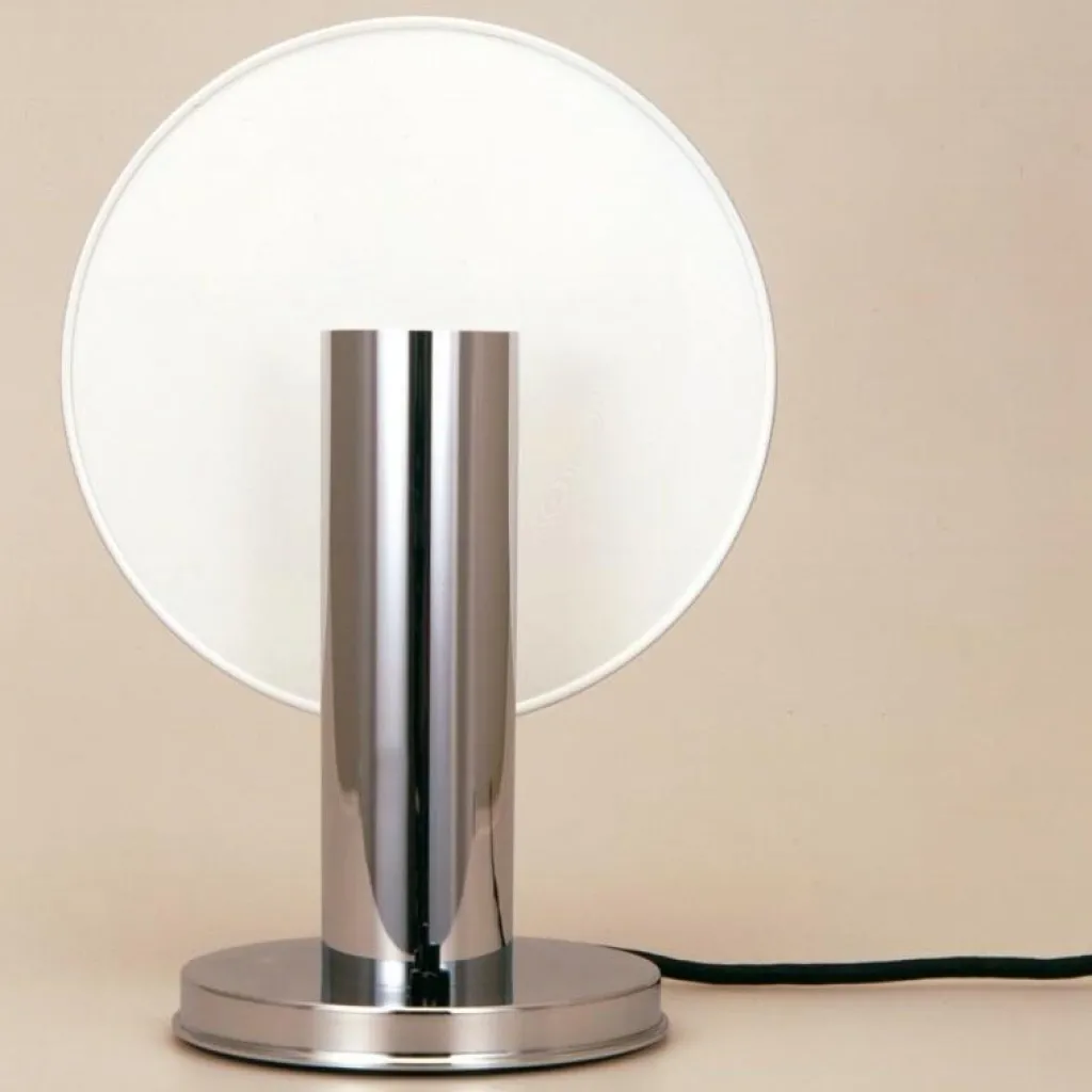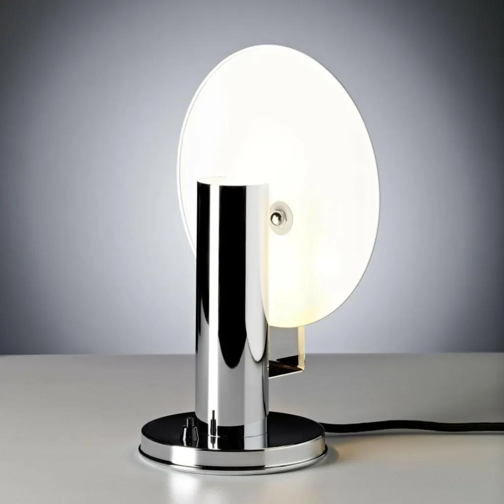 Es wird vermutet, dass das runde Bauhaus-Logo dem Designer als Inspiration diente. Er gestaltet den Leuchtenschirm nämlich als Scheibe. Der Reflektor ist weiß lackiert. Ein runder Sockel gewährt der De Stijl Nachttischleuchte festen Stand. Darauf ist ein Zylinder befestigt, in dem das Leuchtmittel eingeschraubt wird. Schaltet man die De Stijl Nachttischleuchte ein, wird die Reflektorscheibe angestrahlt. So sorgt die Leuchte für blendfreies Licht, dass sanft in alle Richtungen ausstrahlt. Durch Drehen kann die Reflektorscheibe seitlich verstellt werden. Das Gestell wird aus verchromtem Metall gemacht.