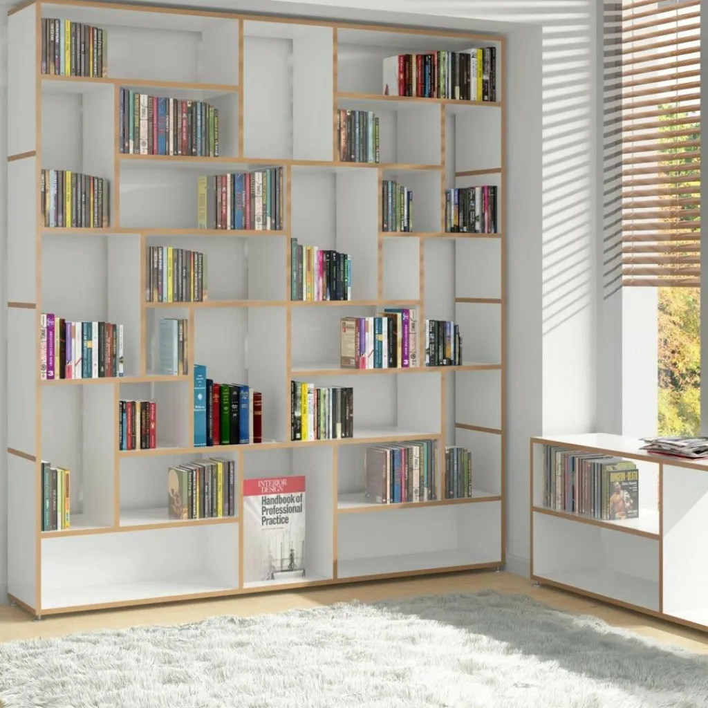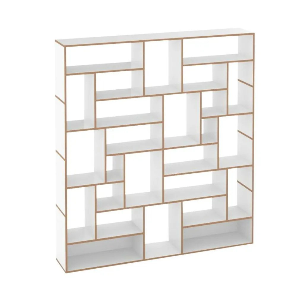 Die ausgeklügelte Konstruktion des Regalsystems basiert ausschließlich auf einzelnen H-förmigen Elementen, die aufeinandergestapelt und durch einen fortschrittlichen Mechanismus ganz ohne Schrauben miteinander verbunden werden. Das modular aufgebaute Möbelstück besteht aus robusten MDF-Platten mit einer schützenden Melaminharz-Beschichtung und bietet optimierte Widerstandsfähigkeit sowie einen stabilen Stand. Die offenen MDF-Kanten setzen sich kontrastreich von den glatten Regalflächen ab und verleihen dem hochwertigen Regalsystem ein reizvolles Aussehen.