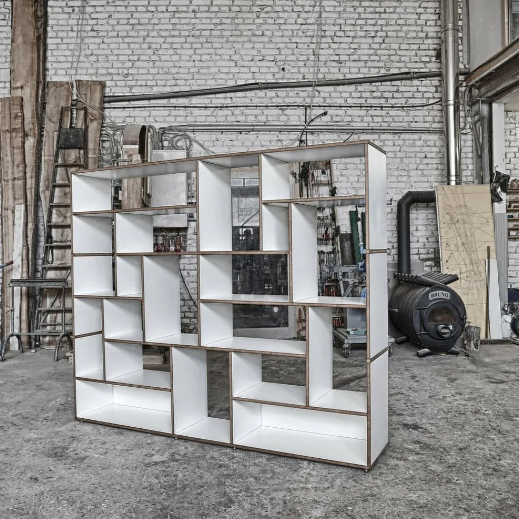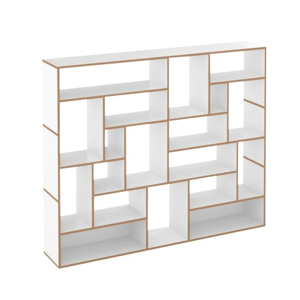 Die ausgeklügelte Konstruktion des Regalsystems basiert ausschließlich auf einzelnen H-förmigen Elementen, die aufeinandergestapelt und durch einen fortschrittlichen Mechanismus ganz ohne Schrauben miteinander verbunden werden. Auf diese Weise entstehen vier Varianten des modernen Regalsystems mit einer Höhe von jeweils 58, 112, 166 und 220 cm. Alle Ausführungen weisen eine Breite von 198 cm auf, bei einer Tiefe von 35 cm. Das modular aufgebaute Möbelstück besteht aus robusten MDF-Platten mit einer schützenden Melaminharz-Beschichtung und bietet optimierte Widerstandsfähigkeit sowie einen stabilen Stand. Die offenen MDF-Kanten setzen sich kontrastreich von den glatten Regalflächen ab und verleihen dem hochwertigen Regalsystem ein reizvolles Aussehen.