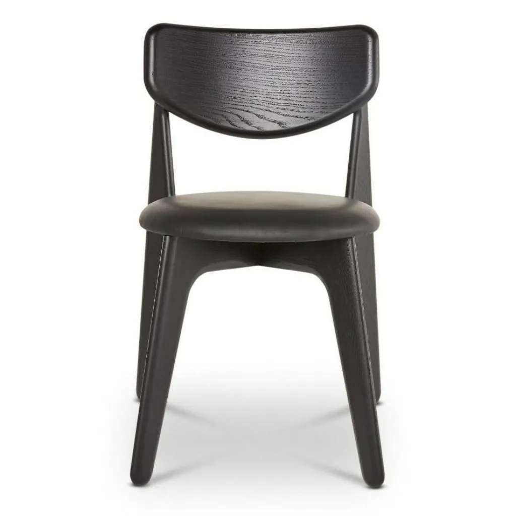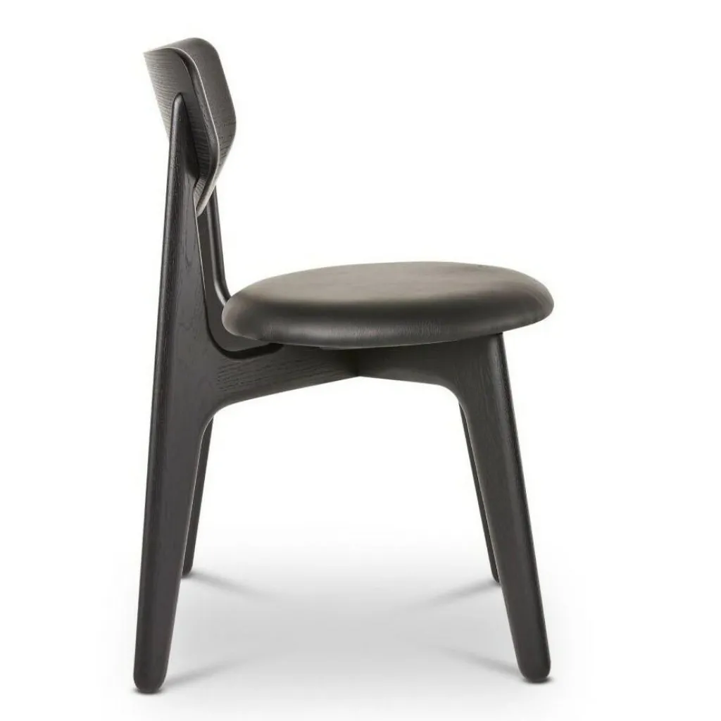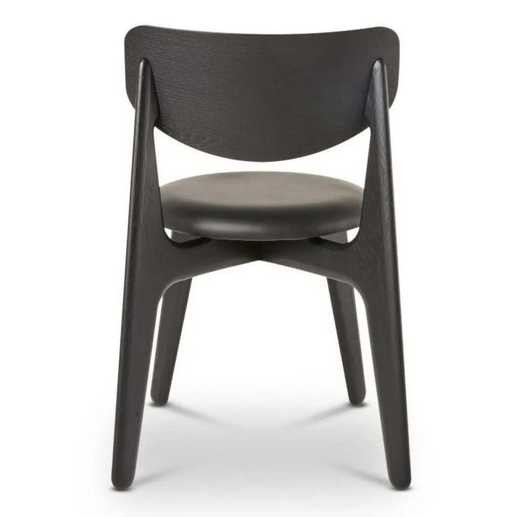 Mit unverwechselbarem Design zeichnet sich der Slab Stuhl gepolstert aus. Die vier Beine stehen nicht gerade, sondern schräg zueinander. Die hinteren Beine gehen in einem Stück in die Rückenlehne über. Sie ist an der Oberkante gerade und an der Unterseite rund geschnitten. Das Gestell wird aus hochwertigem Eichenholz hergestellt. Einen interessanten Kontrast dazu bildet die runde Sitzfläche. Zum hervorragenden Sitzkomfort des Stuhls trägt eine weiche Polsterung aus CMHR-Schaum bei. Sie ist mit edlem Leder überzogen. Die Designer ließen sich von der stattlichen Erscheinung von Bullen inspirieren. Daher wirkt das Design kraftvoll und maskulin.