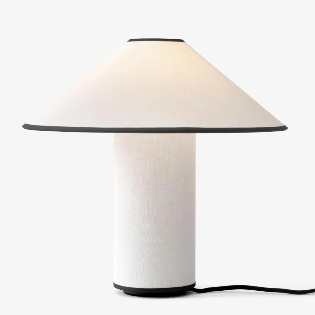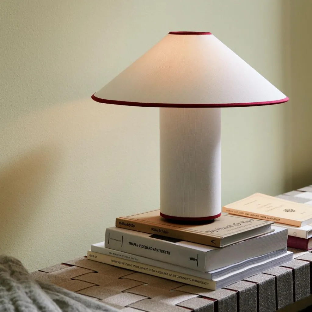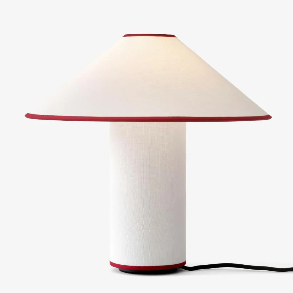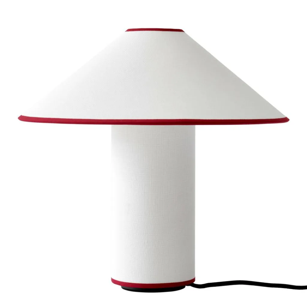 Mit einem zylindrischen Schaft und dem kegelförmigen Schirm ist das Design der Colette ATD6 Tischleuchte schlicht. Auch ihr heller Ton fügt sich harmonisch in die Umgebung ein. Einen Hauch von Extravaganz versprühen hingegen die farbigen Ränder, mit denen ihr Leuchtenschirm sowie der Fuß eingefasst sind. Ein schwarzes Stoffkabel rundet die elegante Erscheinung ab. Die Colette ATD6 Tischleuchte ist ganz mit einem Baumwoll-Leinen-Gewebe überzogen. Dieses umhüllt eine stabile Basis aus Aluminium und Gusseisen. Eine PVC-Schicht im Schirminneren dient als Reflexionsfläche, die einen angenehm weichen Lichtkegel nach unten wirft, während ein diffuser Schein durch die Textilhaut des Leuchtenschirms nach außen dringt. Damit ist die Colette ATD6 Tischleuchte eine attraktive Lichtquelle auf einem Beistelltisch oder Nachtkästchen. Auch in einem Hotel macht sich die Designleuchte gut.
