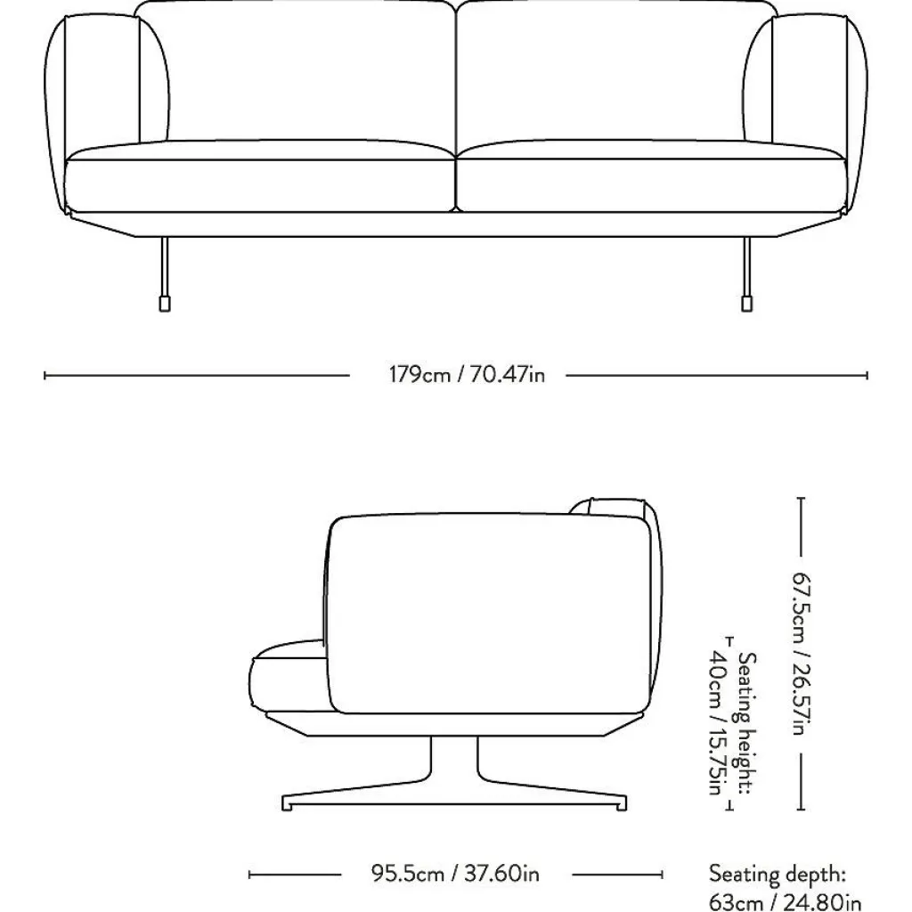 Das Inland AV22 2-Sitzer Sofa ist 179cm breit und 95,5cm tief. Seine Sitzhöhe ist 40cm. Insgesamt ist das Sofa 67,5cm hoch. Es wiegt 78kg und ist in verschiedenfarbigen Ausführungen erhältlich.