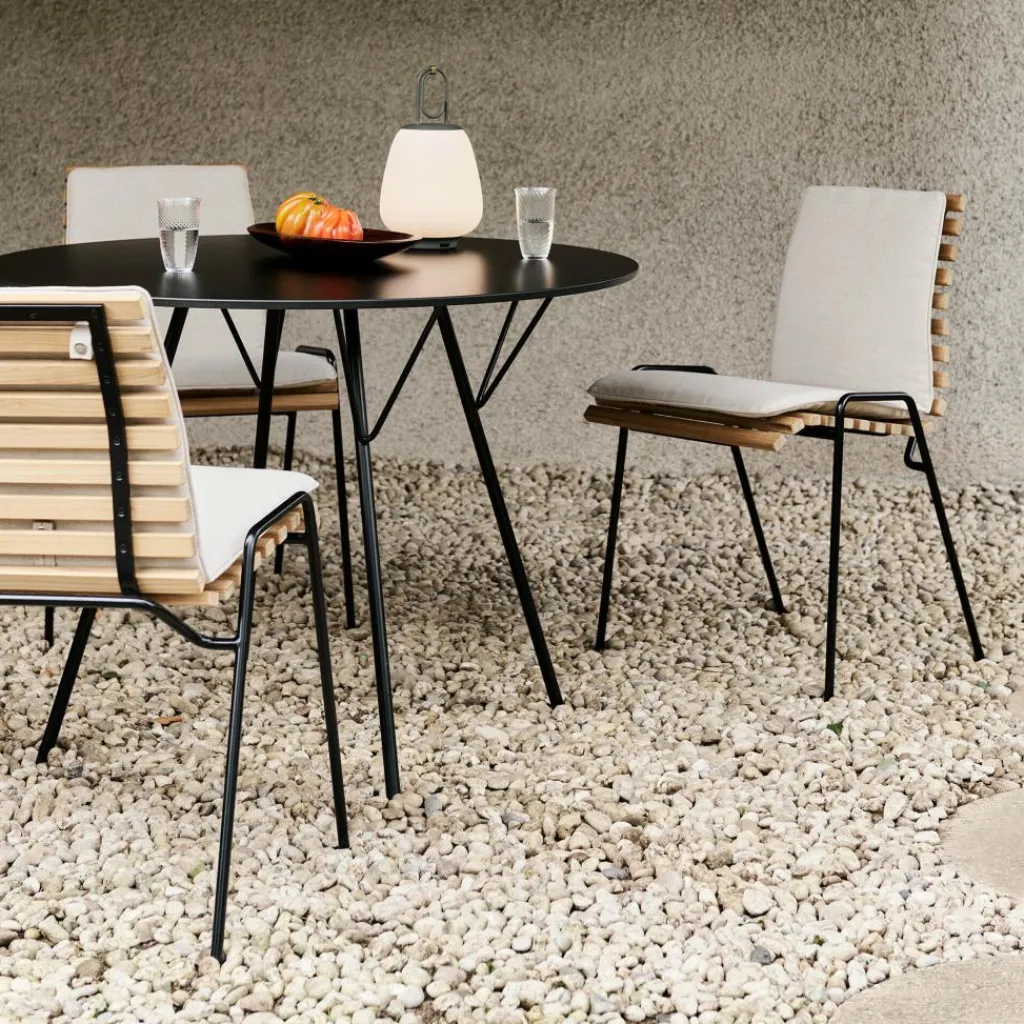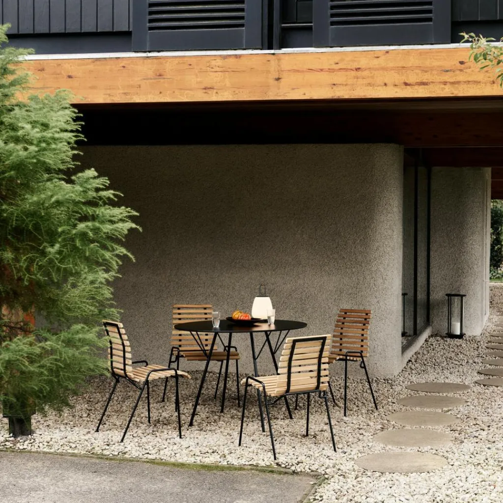 Passende Gartenstühle aus der Kollektion Royal Festival Hall von &Tradition ergänzen die Sitzgruppe rund um den Tisch für den Balkon und die Terrasse. Der Tisch ist außerdem designgleich mit einem kleineren Durchmesser verfügbar.