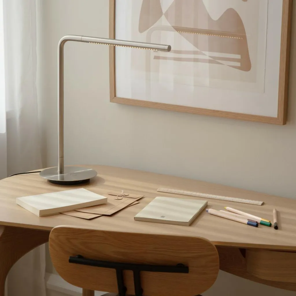 Mit ihren schlanken Stabelementen aus Aluminium erinnert die Omni LED Tischleuchte auf den ersten Blick an ein rechtwinklig gebogenen Leitungsrohr. Dabei lässt die matte Oberfläche, die wahlweise lackiert ist, ein edles Designobjekt erahnen. Eingeschaltet entpuppt sich das formschöne Stück als stimmungsvolle Lichtquelle. Die LEDs, die in kleinen Löchern an der Unterseite des Lichtmoduls versenkt sind, erzeugen ein attraktives Strahlenmuster, das sich dank des um 360 Grad drehbaren Leuchtenkopfes exakt positionieren lässt. Zudem ist der Leuchtstiel um 45 Grad drehbar. Die scheibenförmige Basis aus Stahl garantiert einen kippfreien Stand. Die Omni LED Tischleuchte ist perfekt für den Schreibtisch und passt ebenso gut auf das Nachtkästchen oder einen Beistelltisch neben dem Sofa.