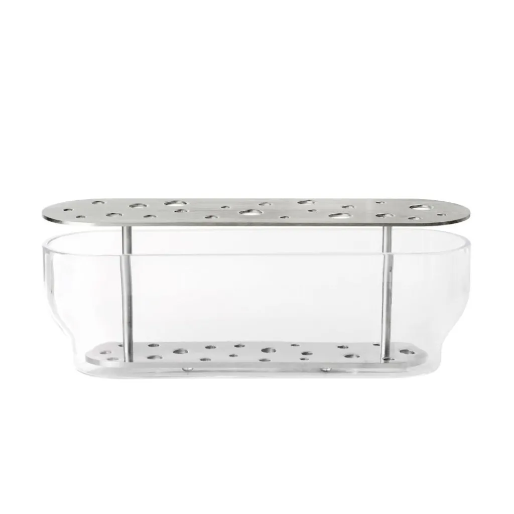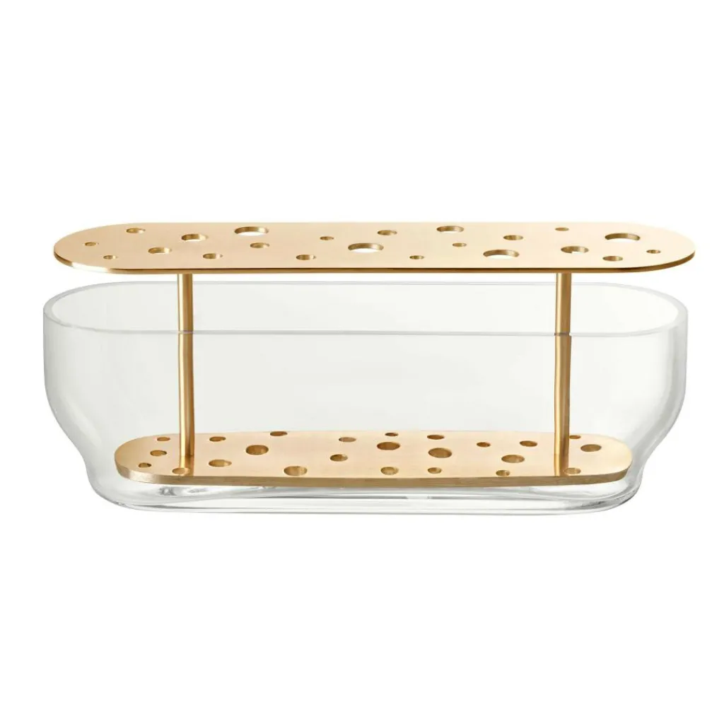 Mit der Ikebana Vase lang wird jede einzelne Blume vom Stiel bis zur prachtvollen Blüte gewürdigt. Das liegt am speziellen Aufbau der Vase. Sie besteht aus einer lang gezogenen Glasschale. Sie wird in liebevoller Handarbeit mundgeblasen. Zum Lieferumfang gehört ein elegantes Gestell aus Edelstahl dazu. Es besteht aus zwei ovalen Plattformen, die mit zwei Stäben verbunden ist. Beide Ebenen sind durchlöchert. Somit können Schnittblumen perfekt arrangiert werden. Sie behalten dank des Gestells ihre aufrechte Haltung. Da die Löcher einen unterschiedlichen Durchmesser aufweisen, ist der Phantasie beim Arrangieren der Blumen keine Grenze gesetzt.