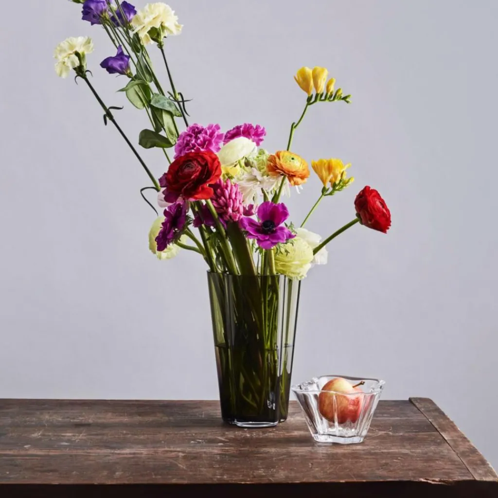 Die formschöne Alvar Aalto Vase 220mm wurde von Designer Alvar Aalto für den Hersteller iittala entworfen. Die dekorative Vase aus mundgeblasenem Glas eignet sich ideal für Arrangements langstieliger Blumen, einzelner Äste oder größerer Sträuße. In ihrer zeitlosen, organischen Wellenform lehnt sie sich stark an das bekannte Original aus der Finlandia-Kollektion an, kommt aber insgesamt etwas höher daher.