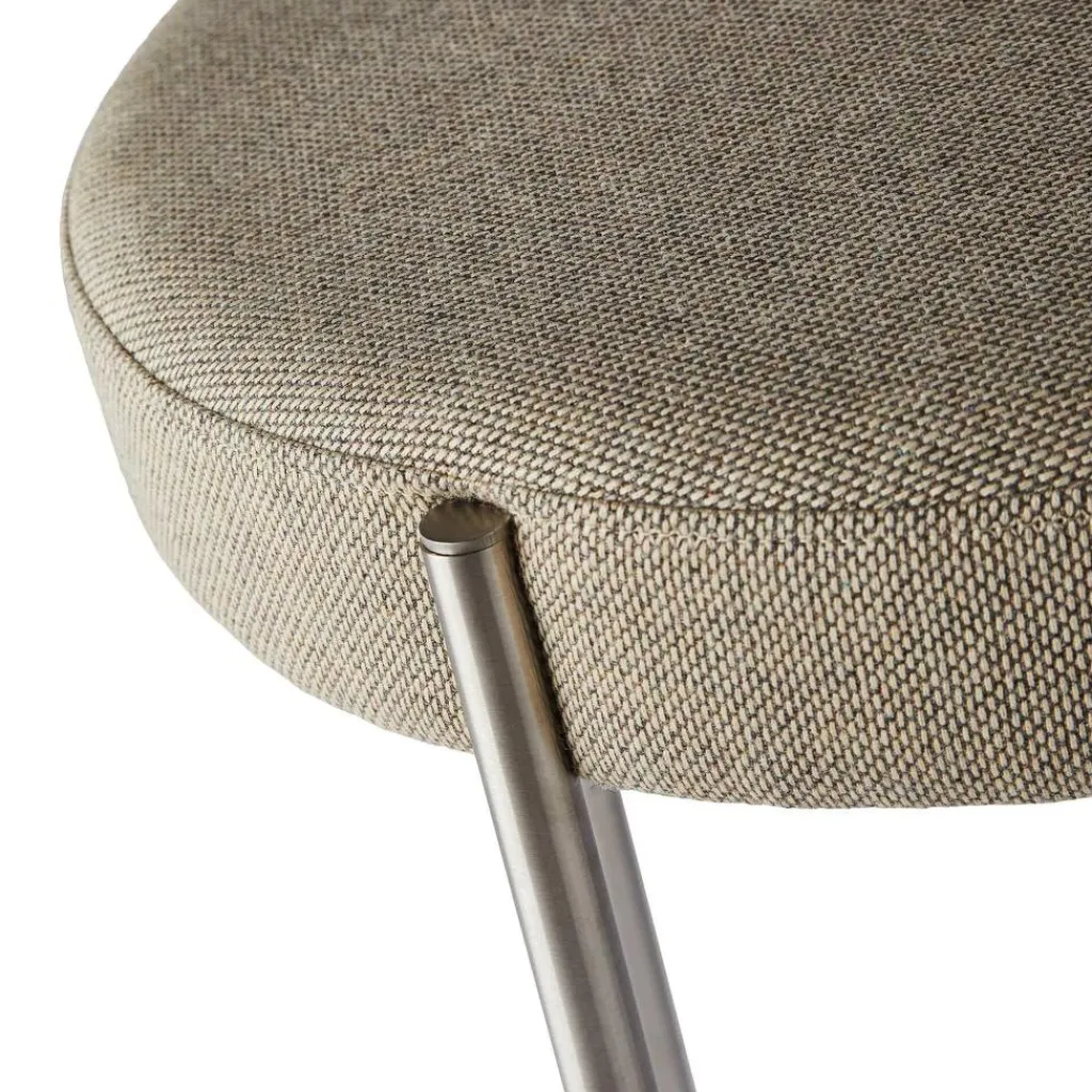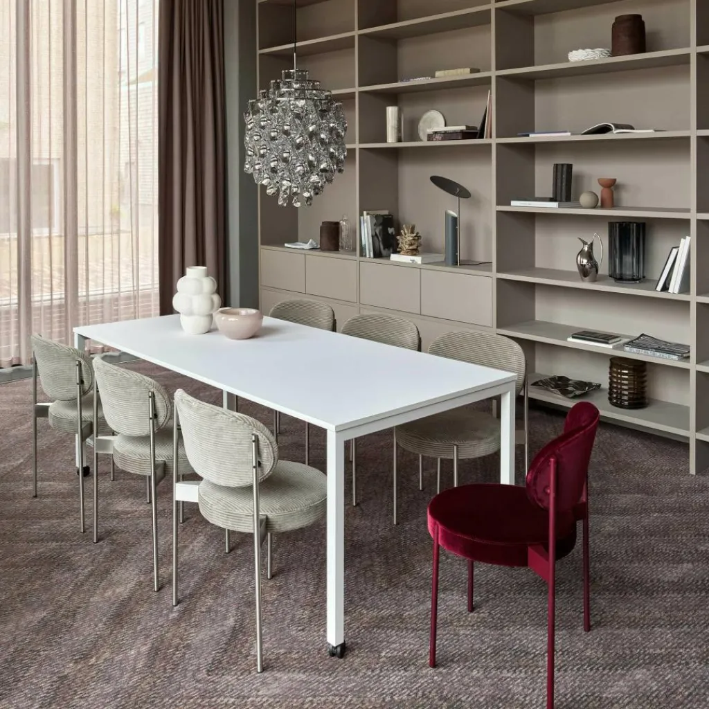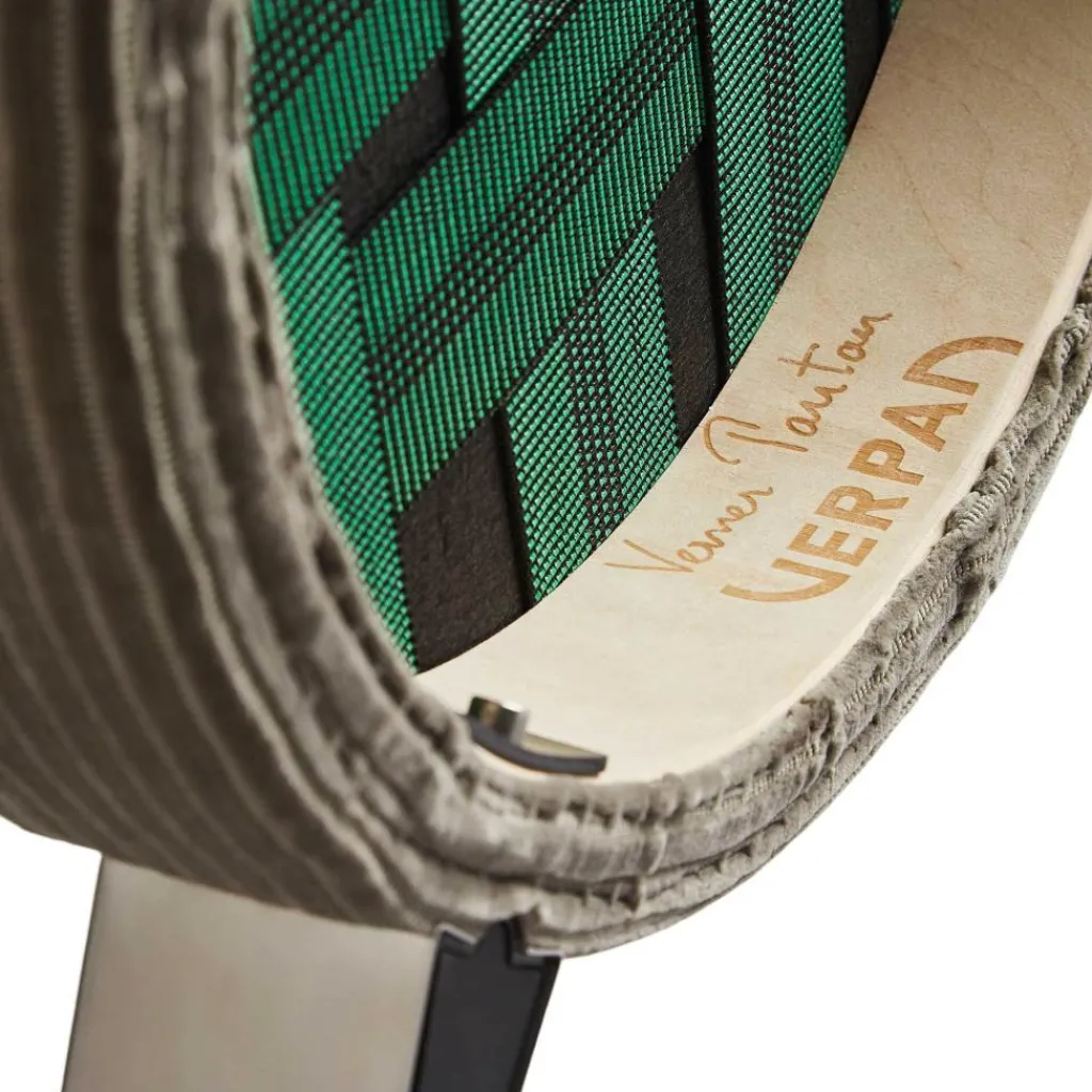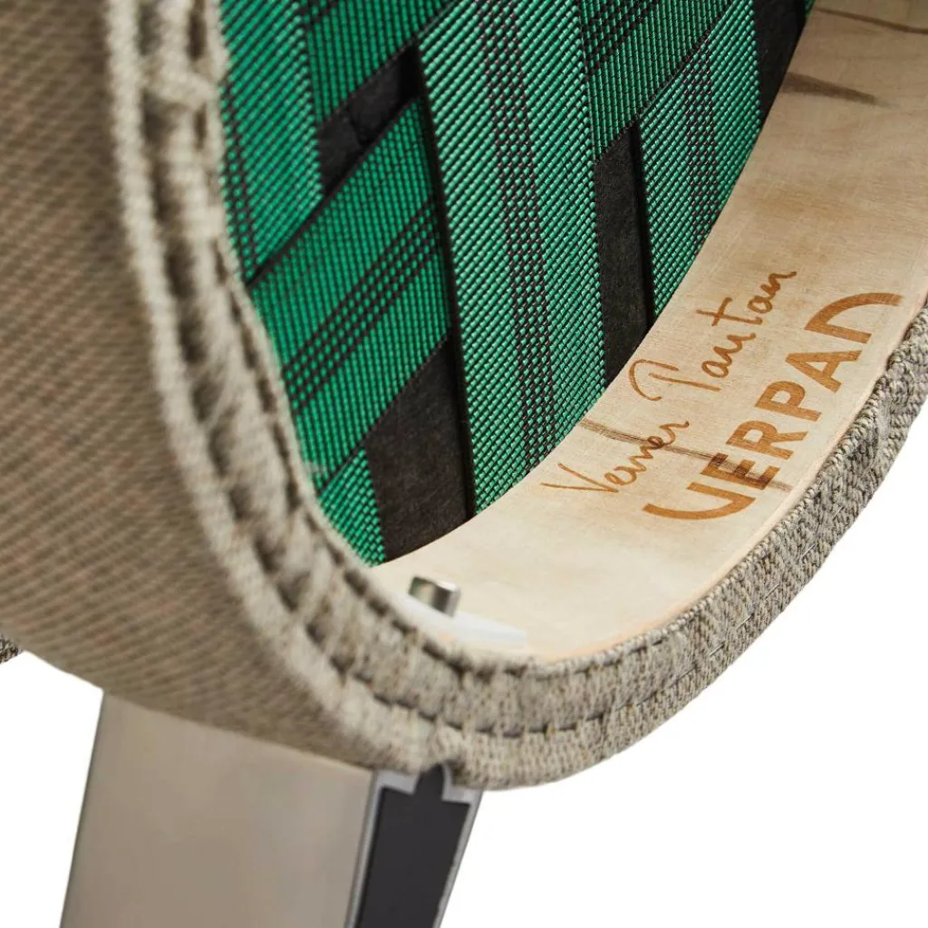 Der Series 430 Stuhl Gestell Stahl unterscheidet sich deutlich von den anderen Entwürfen Verpans, der als Vorreiter von Pop-Art-Möbeln gilt. Er verwendet ein scheinbar filigranes Gestell aus Stahlrohr. Die vier Sesselbeine sind an der Außenkante der Sitzfläche angebracht und somit deutlich sichtbar. Einen ansprechenden Kontrast zum nüchternen Metall bildet die Sitzfläche: Sie ist rund geformt und mit CMHR-Schaum weich gepolstert. Die Rückenlehne beschreibt ein gewölbtes Oval. Beide Elemente sind mit hochwertigem Stoff bespannt. Er stammt aus der dänischen Textilmanufaktur Kvadrat. Mit seinem schlichten skandinavischen Entwurf passt der Series 430 Stuhl Gestell Stahl in jedes Wohn- und Esszimmer. Das in verschiedenen Farben erhältlich Modell ist stapelbar und wird daher gerne im Eventbereich und in Büros eingesetzt.