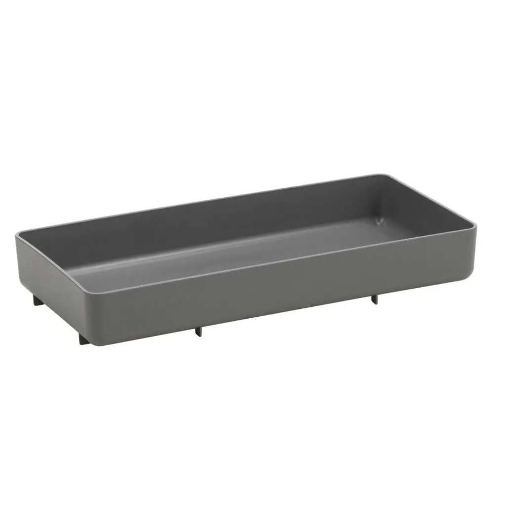Mit seinen schmalen Maßen eignet sich das Tablett auch für ein geringes Platzangebot. Das Tablett ist 41,5 cm lang und 20 cm breit. Die Höhe beträgt 6,5 cm. Hergestellt wird das Modell aus Kunststoff. Der Designer verwendet dafür recyceltes Polypropylen. Das Tablett ist recycelbar.