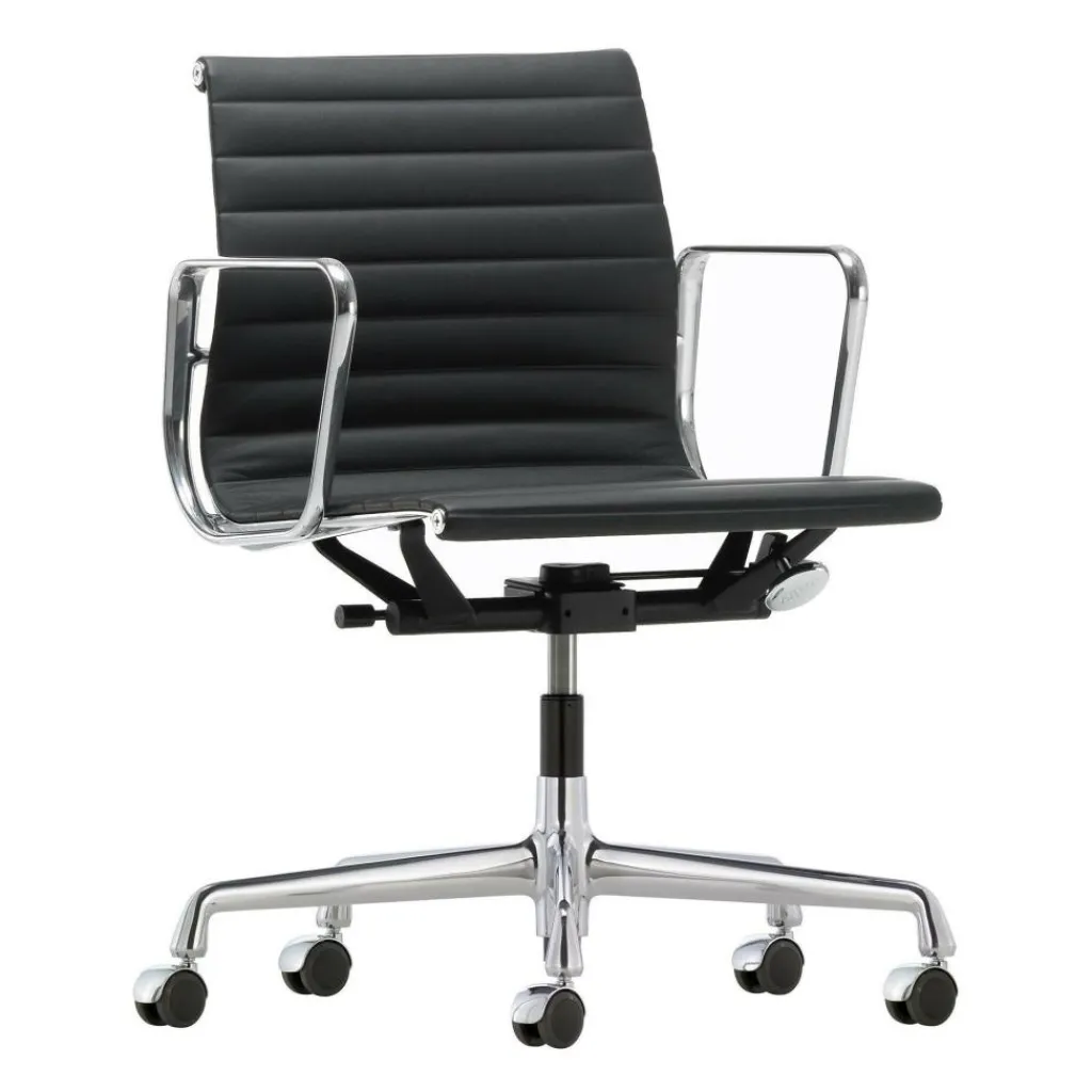 Für das robuste und leichte Untergestell verwendet der Hersteller Aluminium, das mit einer glänzenden Chrombeschichtung versehen ist. Dessen silberne Farbe bildet einen starken Kontrast zum schwarzen Leder und zu den dezent verteilten schwarzen Akzenten am Gestell. Der Drehstuhl ist mit leichtgängigen Rollen ausgestattet, die sich für eine Benutzung auf harten Böden wie Fliesen, Laminat oder Parkett eignen. Um die Sitzhöhe vom EA 117 Alu Chair Bürostuhl Gestell verchromt individuell einzustellen, genügt ein Griff unter die Sitzfläche. Dort befindet sich eine Schaltung der Liftmechanik, die eine stufenlose Höhenregulation unterstützt. Mit diesem Bürostuhl erhalten Sie für die Ausstattung Ihrer Geschäftsräume eine praktische und formschöne Sitzgelegenheit der Oberklasse.
