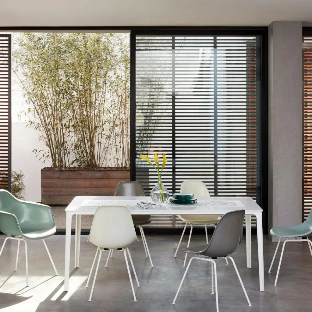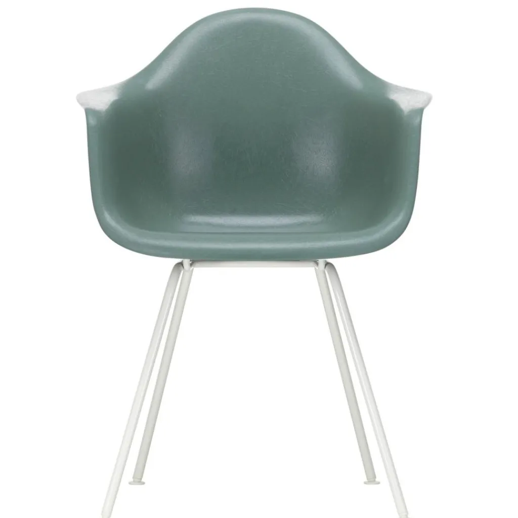 Die Sitzschale des Eames Fiberglass Armchair DAX Gestell weiß besteht aus Fiberglas, einer Verbindung aus dem hochwertigen Material Polyester, dessen Struktur durch die Einarbeitung von Glasfasern verstärkt wird. Je nach Farbvariante und Lichteinfall wirkt die Sitzschale leicht transparent. Als Untergestell dient ein vierbeiniges Stahlgestell, das mit einem widerstandsfähigen Pulverlack glänzend weiß beschichtet wurde. Die Produktbezeichnung DAX steht für „Dining Height Armchair X-Base“ und weist auf die perfekten Eigenschaften des Fiberglass Armchairs als Esszimmer-Möbel hin. Der hochgezogene Rückenteil geht nahtlos in die Armlehnen und die breite Sitzfläche über. Das großzügige Platzangebot sorgt für einen herausragenden Sitzkomfort, der durch die angenehme Sitzhöhe von 43 cm noch unterstützt wird.