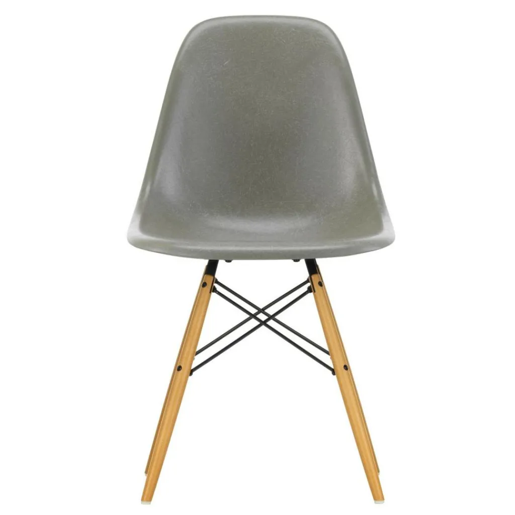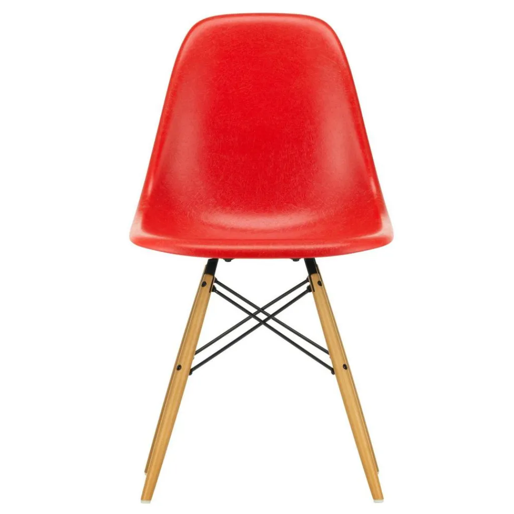 Der Eames Fiberglass Side Chair DSW Ahorn gelb wurde von den Designern Ray Eames und Charles Eames für den Hersteller Vitra entworfen. Der Stuhl gehört zur Produktfamilie der Eames Fiberglass Chairs, die bereits im Jahr 1948 beim Wettbewerb International Competition for Low-Cost Furniture Design, der vom New Yorker Museum of Modern Art initiiert wurde, mit einem Preis ausgezeichnet wurde. Das Konzept der Eames Fiberglass Chairs basiert auf der Idee, eine körpergerecht geformte Sitzschale mit individuellen Untergestellen zu kombinieren.