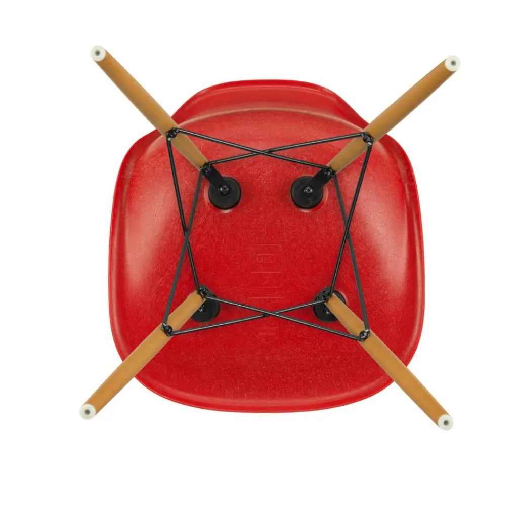 Für den aktuellen Eames Fiberglass Side Chair DSW Ahorn gelb wählte das amerikanische Designer-Ehepaar Charles und Ray Eames ein vierbeiniges Untergestell aus massivem Ahornholz mit einer eher dunklen, leicht ins gelbliche tendierenden Farbgebung. Das Holz stammt von Ahornbäumen Acer platanoides aus kontrollierter Forstwirtschaft in Europa. Die Sitzschale besteht aus durchgefärbtem und glasfaserverstärktem Polyester und ist mit Beschlägen aus schwarzem Stahl am Untergestellt fixiert.