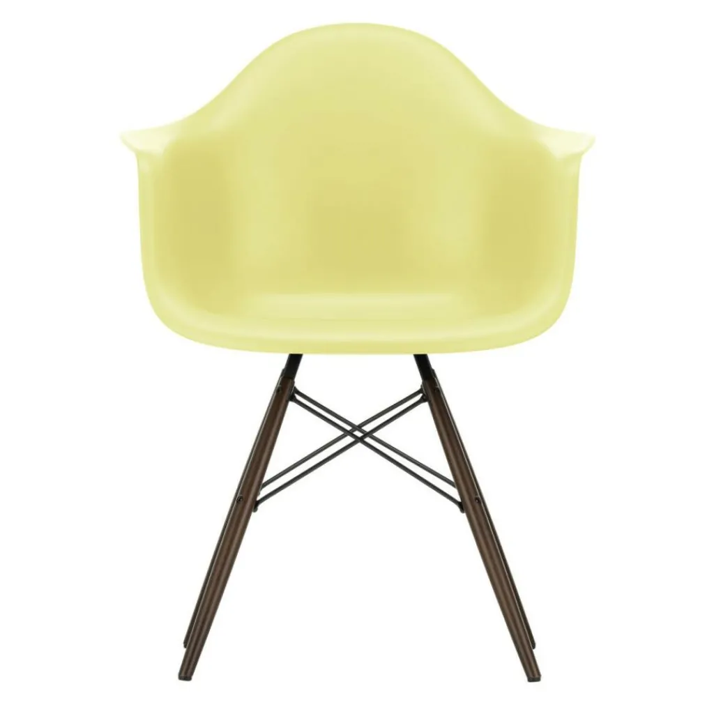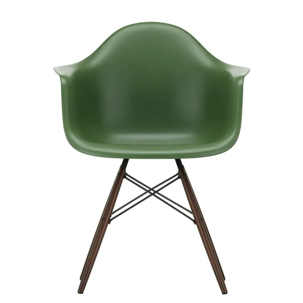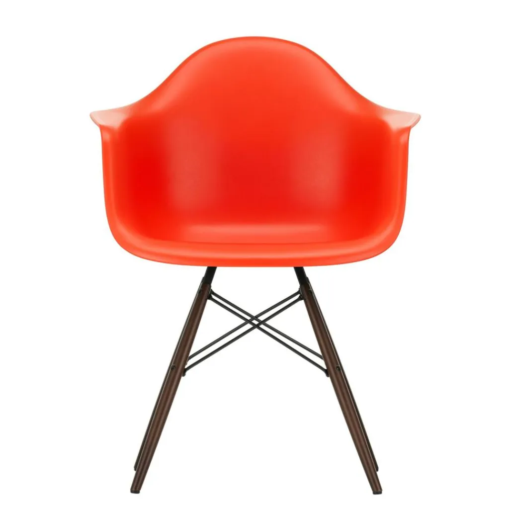 Der Eames Plastic Armchair DAW RE Ahorn dunkel wurde von Ray und Charles Eames für die Marke Vitra entworfen. Er ist Teil einer Serie von Stühlen, die ikonische Designs aus 1950 verwenden und Sitzschalen aus Kunststoff mit verschiedenen Untergestellen kombinieren. Das DAW-Modell beeindruckt mit einer Basis aus Holz. Mit ihrer nachhaltigen Materialwahl präsentieren sich die Eames-Plastic-Armchairs zeitgemäß.