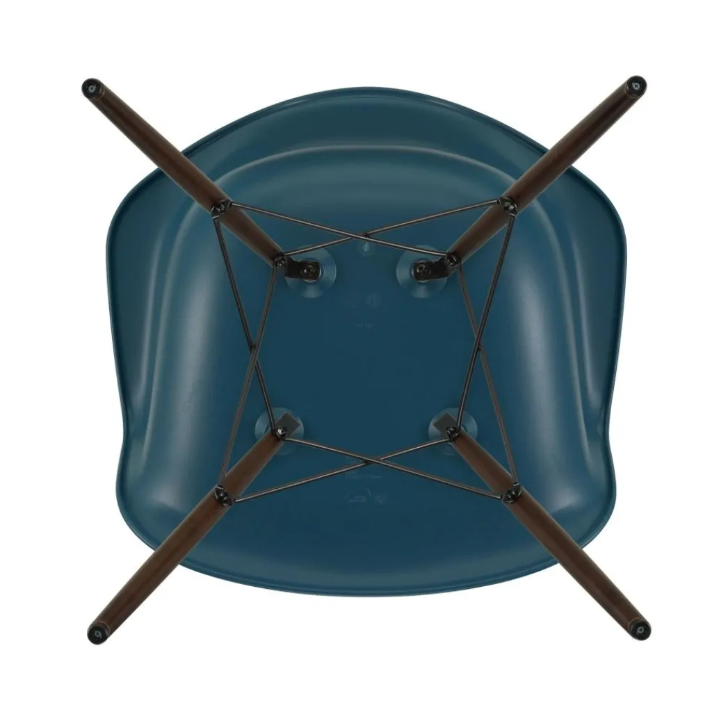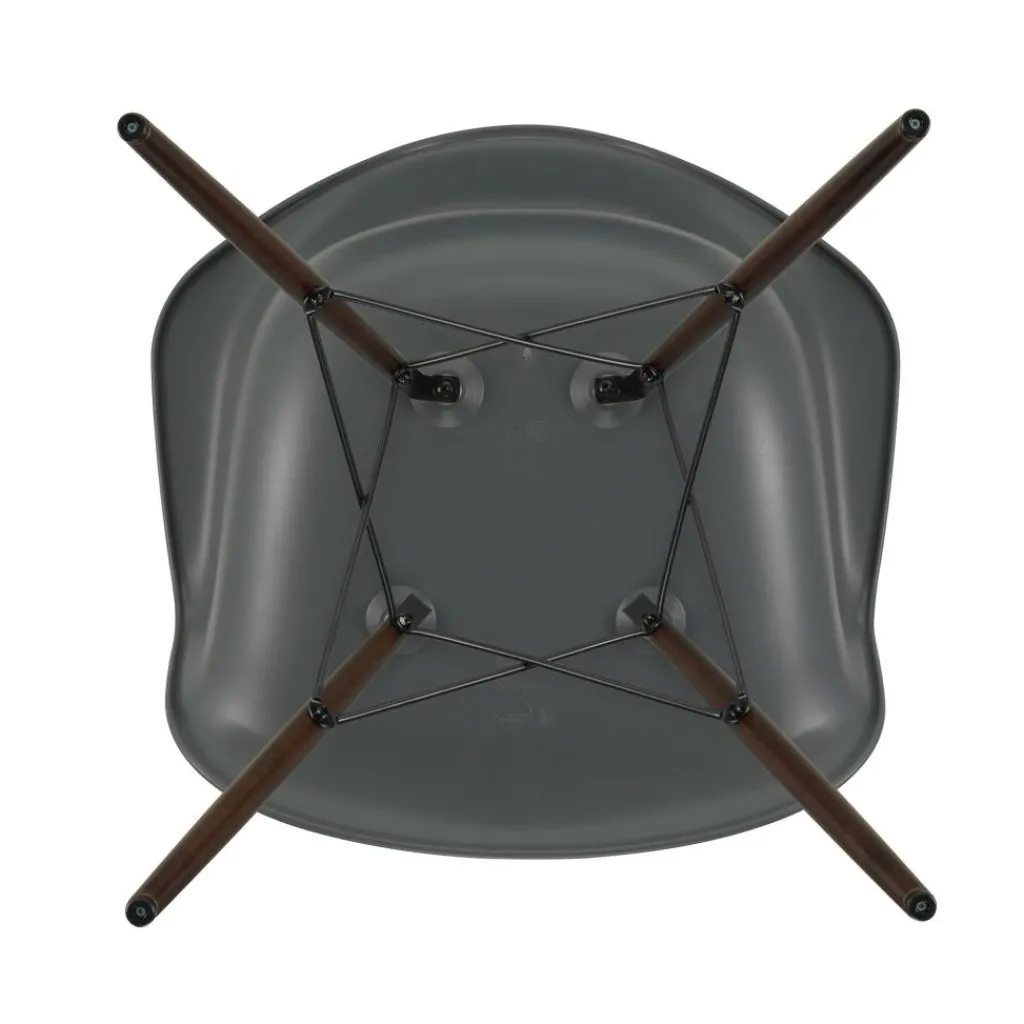 Ein großzügiger, ergonomisch geformter Schalensitz macht den Eames Plastic Armchair DAW RE Ahorn dunkel zu einem bequemen Sitzmöbel, das mit seinem auffälligen Unterbau einen attraktiven Blickfang darstellt. Das vierbeinige Gestell setzt sich aus konisch geschnittenen Stäben aus Ahornholz zusammen. Eine kreuzweise Verstrebung aus Stahldraht schenkt der Konstruktion eine stabile Belastbarkeit. Die Beine sind mit Filzgleitern versehen. So eignet sich der Eames Plastic Armchair DAW RE Ahorn dunkel für harte Böden in einem Warteraum, Café oder im Wohnzimmer. Dabei zeigt die Schale aus recyceltem Post-Consumer-Kunststoff kleine Farbsprenkel, was dem Designstuhl einen individuellen Charakter verleiht.