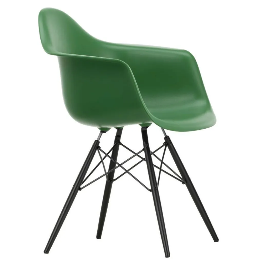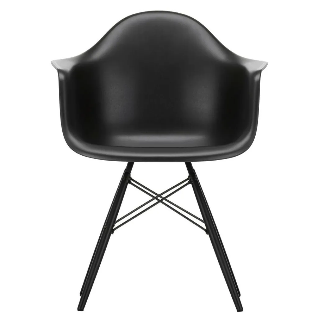 Der Eames Plastic Armchair DAW RE Ahorn schwarz wurde von Ray und Charles Eames für die Marke Vitra entworfen. Er gehört zu einer ikonischen Stuhlserie, die Entwürfe aus 1950 umfasst. Die umfangreiche Kollektion kombiniert Kunststoffschalen mit verschiedenen Untergestellen. Die Benennung DAW für Dining Height Armchair Wood Base dieses Designstuhls spielt auf eine Basis aus Holz an. RE deutet auf sein recyceltes Material hin.