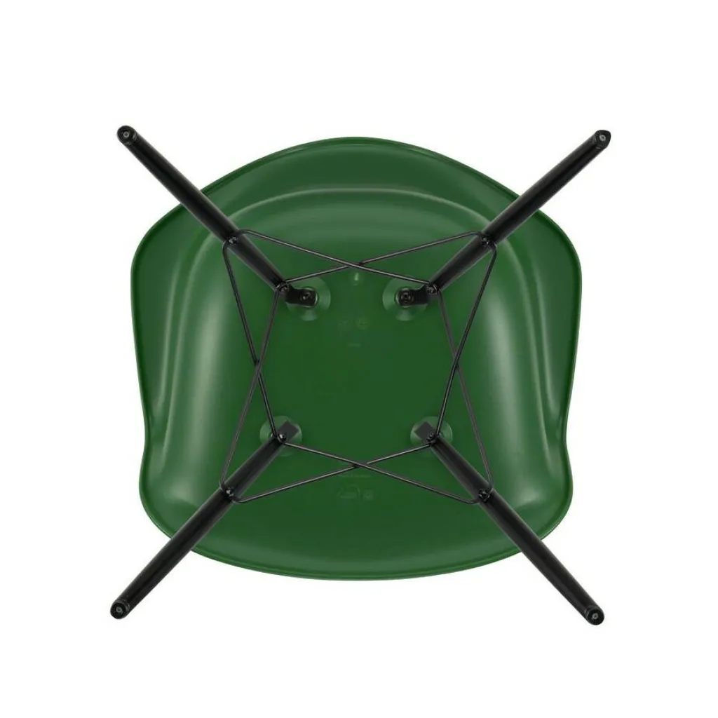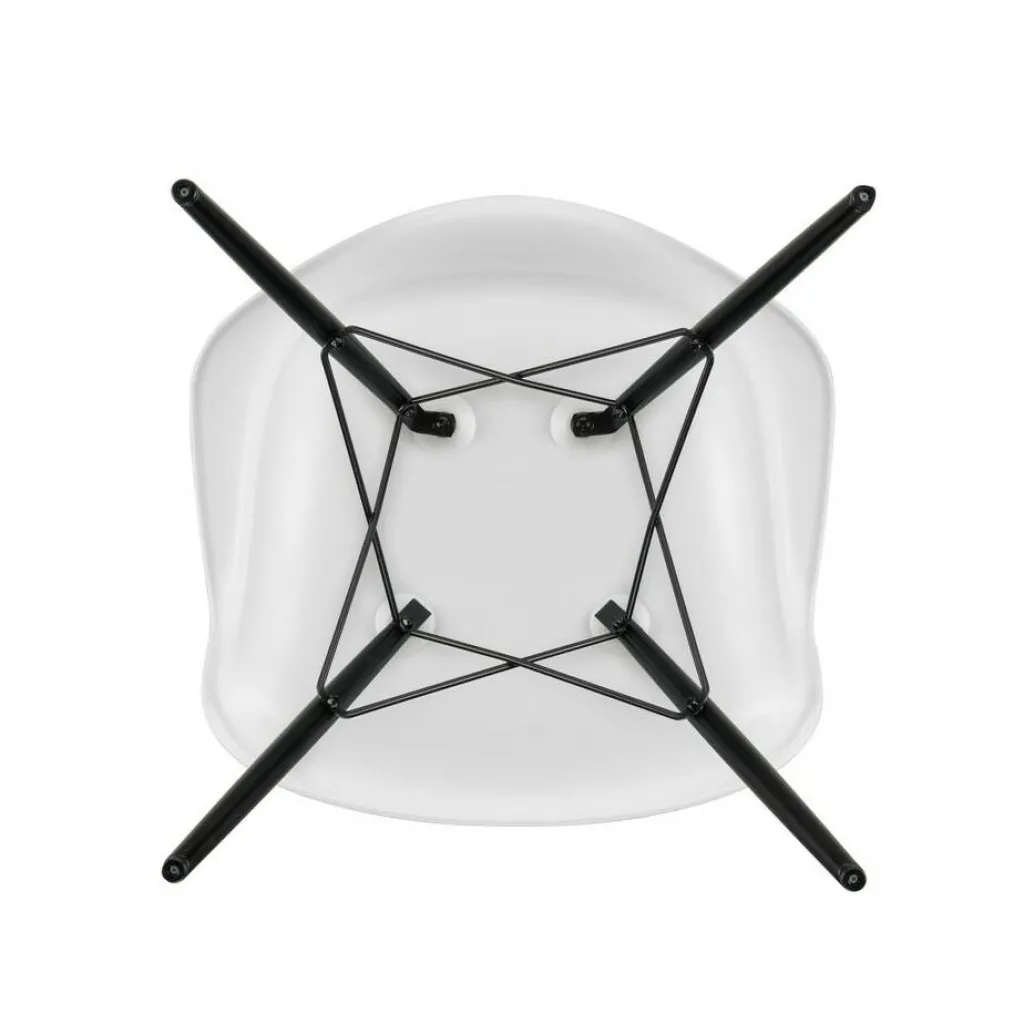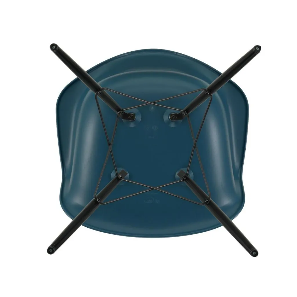 Vier formschöne, konisch geschnittene Stäbe aus Ahornholz bilden den Unterbau. Sie sind weit ausgestellt und mit verkreuzten Verstrebungen versehen, was dem Eames Plastic Armchair DAW RE Ahorn schwarz eine hohe Stabilität schenkt. Ihre dunkle Farbe setzt zudem eine edle Note. Einen angenehmen Sitzkomfort verspricht die Schale, die eine großzügige Sitzfläche, hohe Lehnen und eine breite Auflagefläche für die Arme zeigt. Aus recyceltem Post-Consumer-Kunststoff gefertigt, zeichnet sie den Eames Plastic Armchair DAW RE Ahorn schwarz als nachhaltiges Produkt aus. Der Stuhl ist mit Filzgleitern für harte Böden ausgestattet und passt in ein Café, einen Wartebereich oder ins Wohnzimmer daheim.