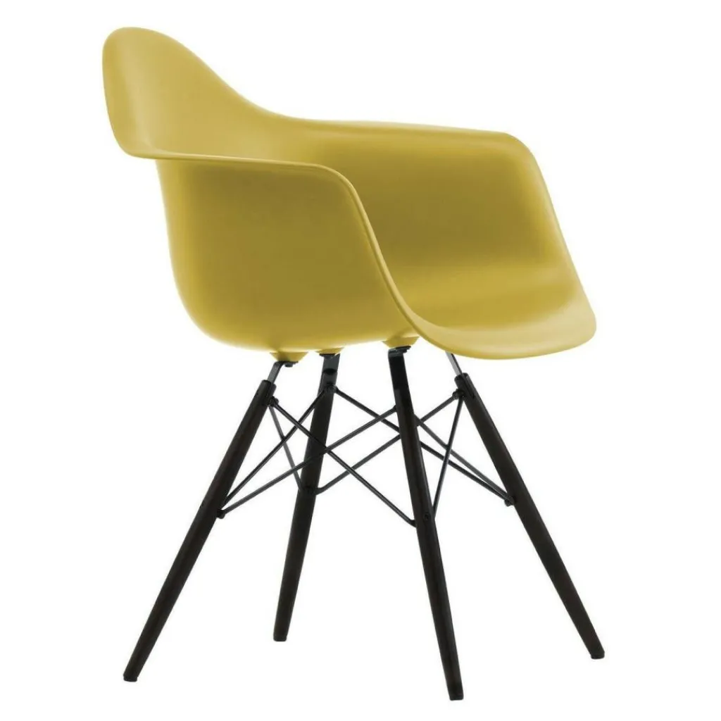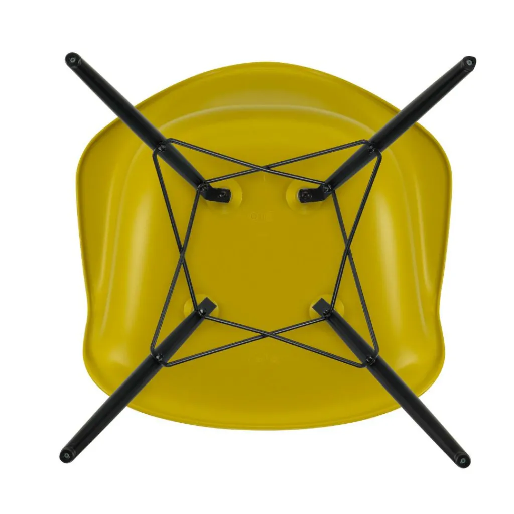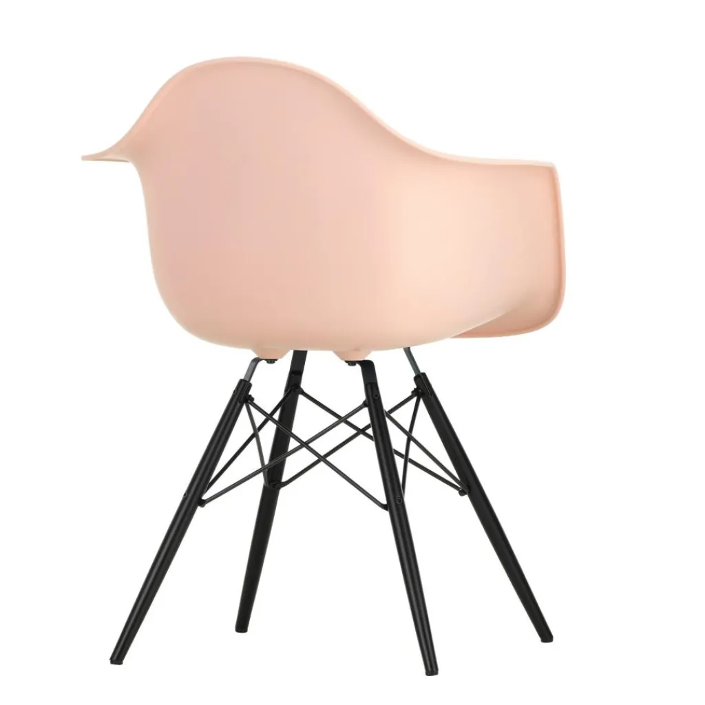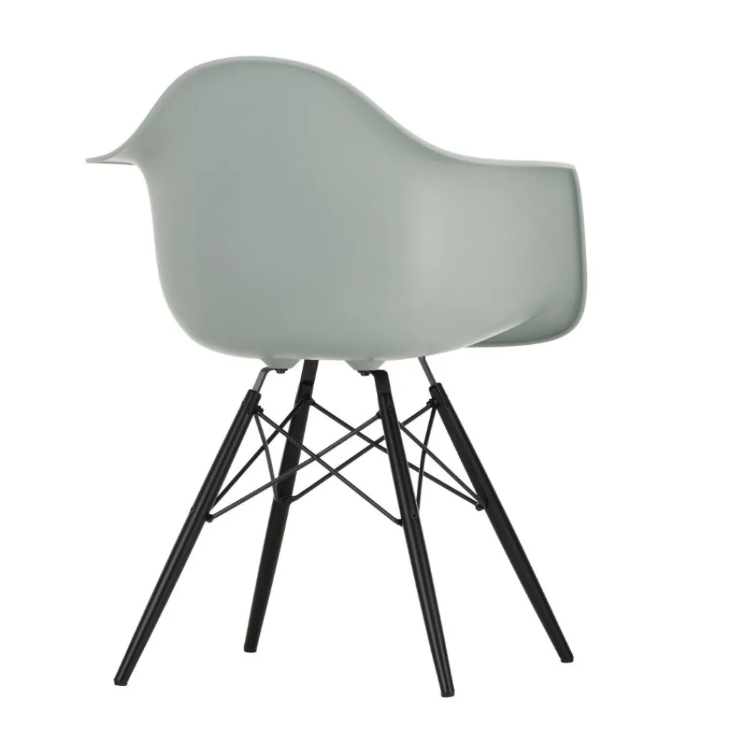 Vier formschöne, konisch geschnittene Stäbe aus Ahornholz bilden den Unterbau. Sie sind weit ausgestellt und mit verkreuzten Verstrebungen versehen, was dem Eames Plastic Armchair DAW RE Ahorn schwarz eine hohe Stabilität schenkt. Ihre dunkle Farbe setzt zudem eine edle Note. Einen angenehmen Sitzkomfort verspricht die Schale, die eine großzügige Sitzfläche, hohe Lehnen und eine breite Auflagefläche für die Arme zeigt. Aus recyceltem Post-Consumer-Kunststoff gefertigt, zeichnet sie den Eames Plastic Armchair DAW RE Ahorn schwarz als nachhaltiges Produkt aus. Der Stuhl ist mit Filzgleitern für harte Böden ausgestattet und passt in ein Café, einen Wartebereich oder ins Wohnzimmer daheim.
