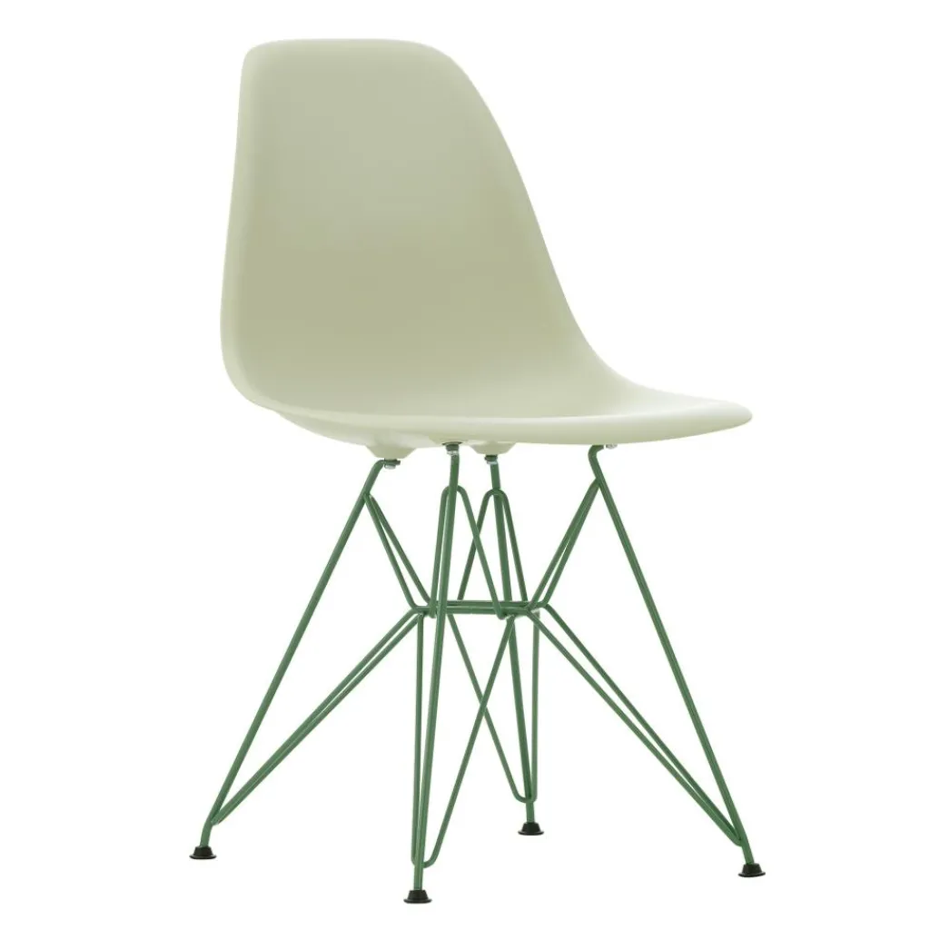 Eine Reihe von filigranen Stahlstäben, die zu einem stabilen Gestell mit weit ausgestellten Stützen verbaut sind, bilden den Unterbau dieses ausgefallenen Designstuhls. Ihre Anordnung garantiert einen belastbaren Stand. Zudem sorgt die Konstruktion, die an den Eiffelturm denken lässt, für einen reizvollen Hingucker. Einen bequemen Sitzkomfort verspricht die sanft geschwungene Schale, die neben einer ergonomisch geformten Sitzmulde auch stark abgerundete Kanten aufweist. Sie besteht aus recycelten Kunststoffen, was den Eames Plastic Side Chair DSR RE Gestell meeresschaum grün zu einem nachhaltigen Sitzmöbel macht. Mit hochwertigen Kunststoffgleitern ausgestattet, passt das Designstück ins Wohnzimmer oder in ein Café. Es eignet sich zudem für den Einsatz im Freien.