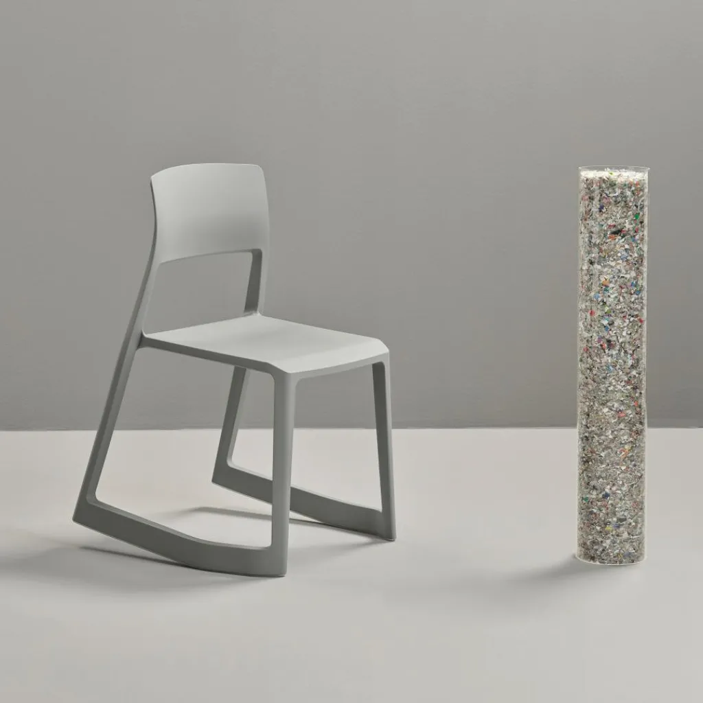 Verlagert man im Tip Ton RE Schaukelstuhl das Körpergewicht leicht nach vorne, kippt er um einige Grad und arretiert in dieser Position. Dadurch werden Becken und Rückgrat aufgerichtet und die Rumpf- und Bauchmuskulatur besser durchblutet. Auch beim Stil hat der Schaukelstuhl einiges zu bieten. Er ist aus einem Guss gefertigt und wirkt mit seinen abgerundeten Kanten harmonisch. Der Tip Ton RE Schaukelstuhl besteht aus recyceltem Polypropylen, das zum Teil aus Verpackungen besteht. Ein Anteil an Glasfasern macht das Modell besonders robust. Außerdem kann der Schaukelstuhl recycelt werden. Ein weiterer Zusatz schützt den Stuhl vor UV-Strahlen. Da man bis zu vier Exemplare übereinanderstapeln kann, lässt er sich platzsparend aufbewahren.