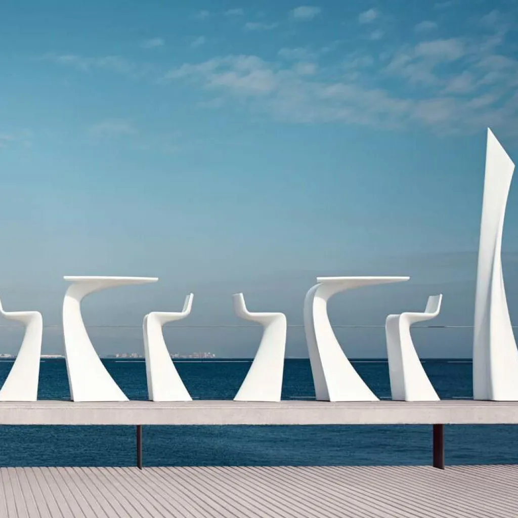 Der Wing Barhocker ist eine Entwicklung von Studio A-cero für das Design-Label Vondom, die sich vor allem durch ihre abstrakte Gestalt und ihre sehr gute Verarbeitungsqualität auszeichnet.