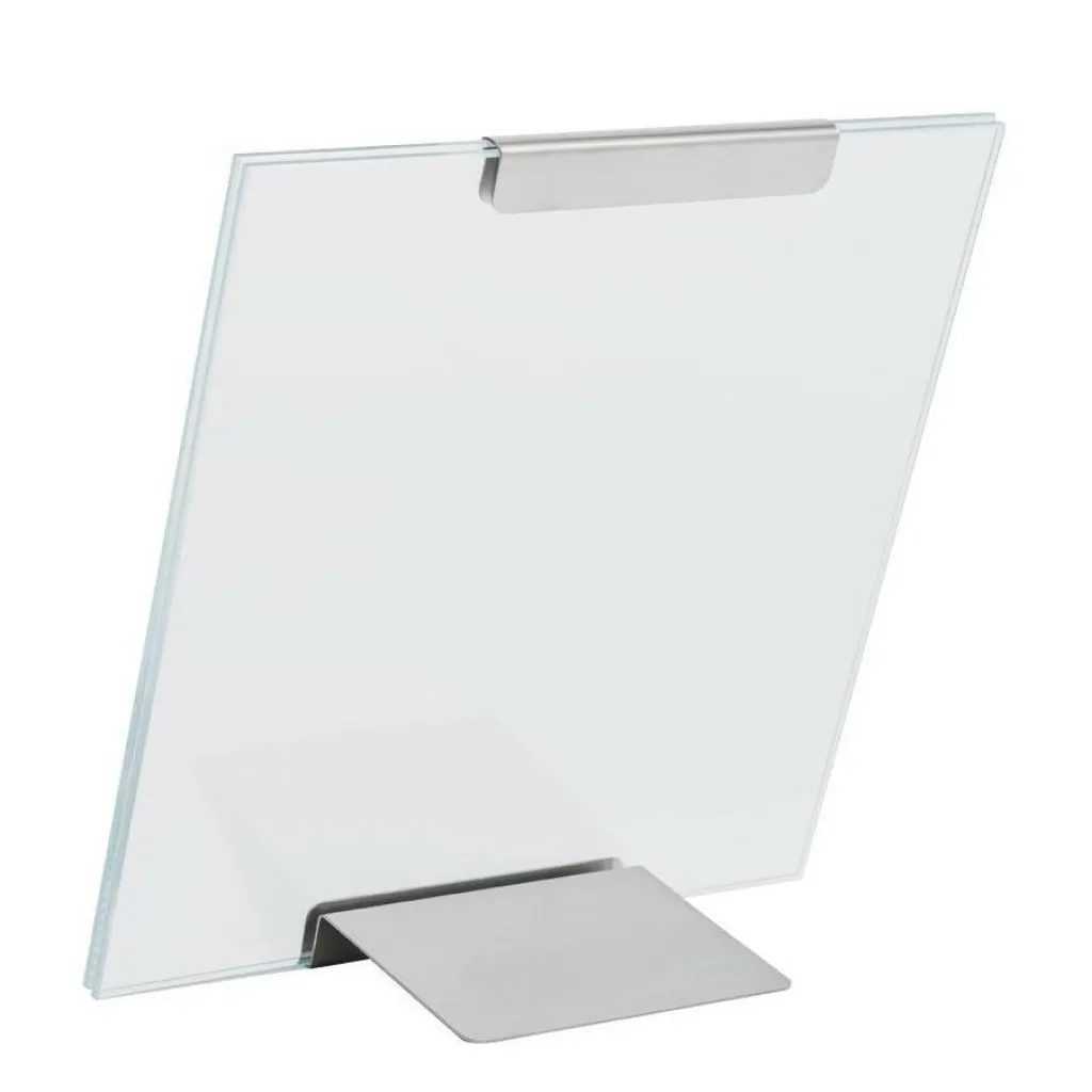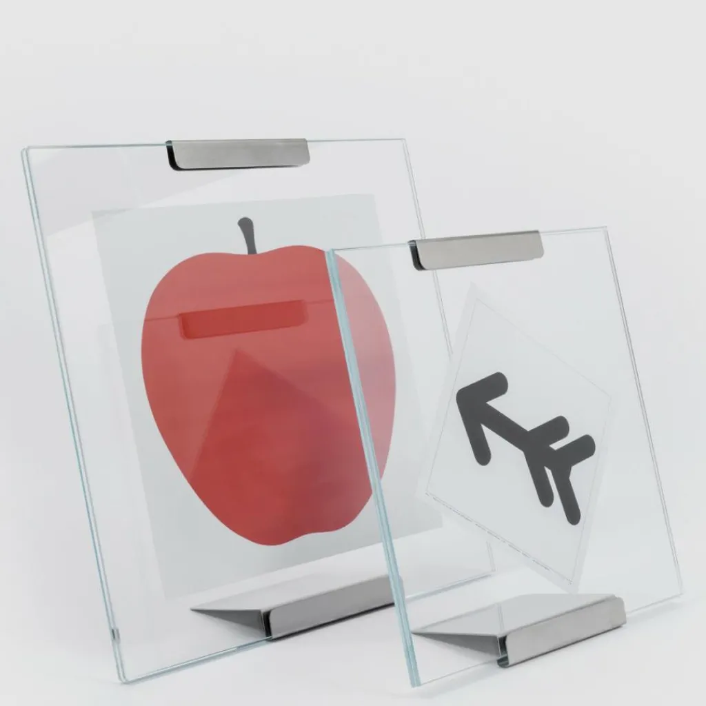 Der Galapagos Bilderrahmen von Danese ist aus Glas gefertigt, der Fuß aus satiniertem Edelstahl garantiert Standfestigkeit.