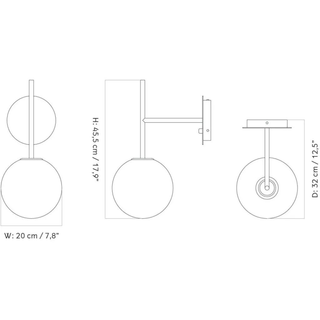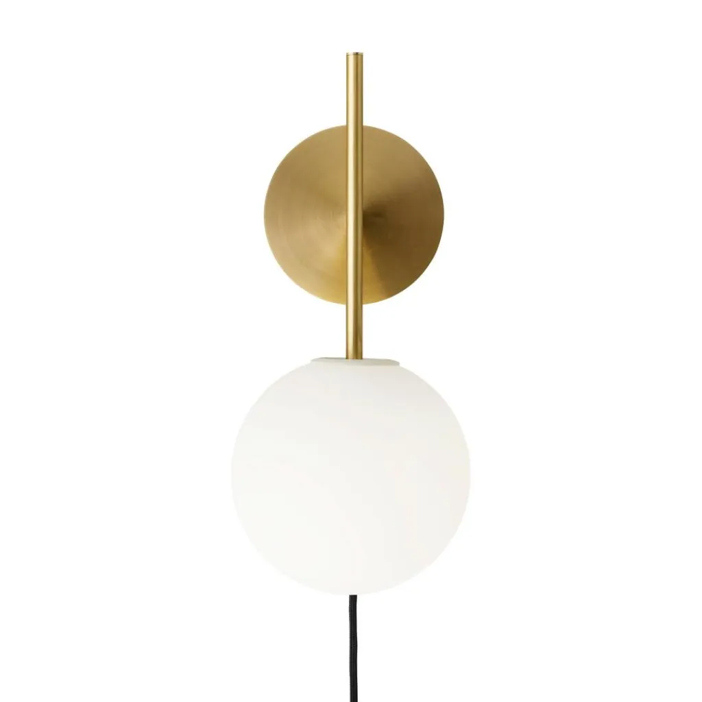 In der TR Bulb Wandleuchte vereinen sich gerade Linien und runde Formen zu einer schlichten und doch raffinierten Ästhetik. Sie besteht aus einem weißen, kugeligen Schirm aus mundgeblasenem Opalglas, der an einem rechtwinkligen Stangenarm aus gebürstetem Messing hängt. Im Inneren des matten Schirms befindet sich ein Kern aus Aluminium, der eine optimale Wärmeableitung des im Lieferumfang enthaltenen LED-Leuchtmittels gewährleistet. Die Wandleuchte ist dimmbar und gibt ein gleichmäßiges, blendfreies Licht in den Raum ab. Gesteuert wird sie über einen Drehknopf an der runden Wandhalterung, die ebenfalls aus Messing gefertigt ist. Das Modell ist mit einem 200cm langen Kabel aus ABS-Kunststoff ausgestattet. Es kann aber auch so an der Wand montiert werden, dass das Kabel unsichtbar bleibt.
