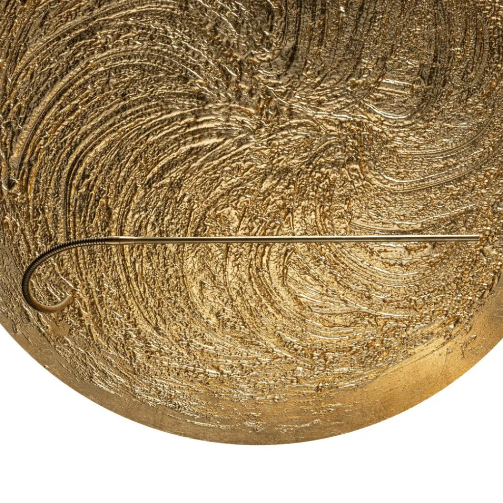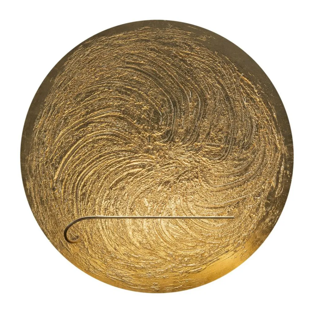 Diese außergewöhnliche Leuchte fasziniert durch ihre handgefertigte, unregelmäßige Oberfläche, die kunstvoll mit goldfarbener Folie veredelt wurde. Im Gegensatz zur Bellatrix A Variante, die mit radialen Linien verziert ist, folgt die Bellatrix B LED Wandleuchte Ø 120 cm einem Design mit eleganten zentripetalen Kurven, die dem Lichtobjekt eine konzentrierte und harmonische Ausstrahlung verleihen. Die Bellatrix-Scheibe wird von neun LED-Platinen hinterleuchtet, die in einen Messingstab mit 10 mm Durchmesser integriert sind. Ein flexibles Messinggelenk ermöglicht es, das Licht individuell auszurichten, sodass der Lichtstrahl präzise platziert werden kann. Der Wechsel von Licht und Schatten, erzeugt durch die unregelmäßige goldene Oberfläche, sorgt für eine indirekte Beleuchtung, die eine angenehme und einladende Atmosphäre kreiert. Mit einem Durchmesser von 120 cm, einer Tiefe von 10 cm und einem Gewicht von 7,8 kg ist die Bellatrix B LED Wandleuchte Ø 120 cm eine perfekte Wahl für die Gestaltung von Räumen, die mit einem faszinierenden Charme und einer warmen, diffusen Beleuchtung erstrahlen sollen. Die Leuchte kann bei geeigneter Hauselektrik gedimmt werden.