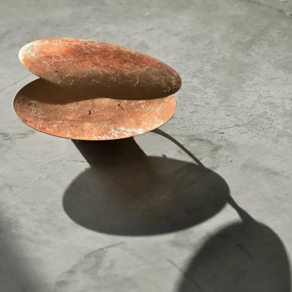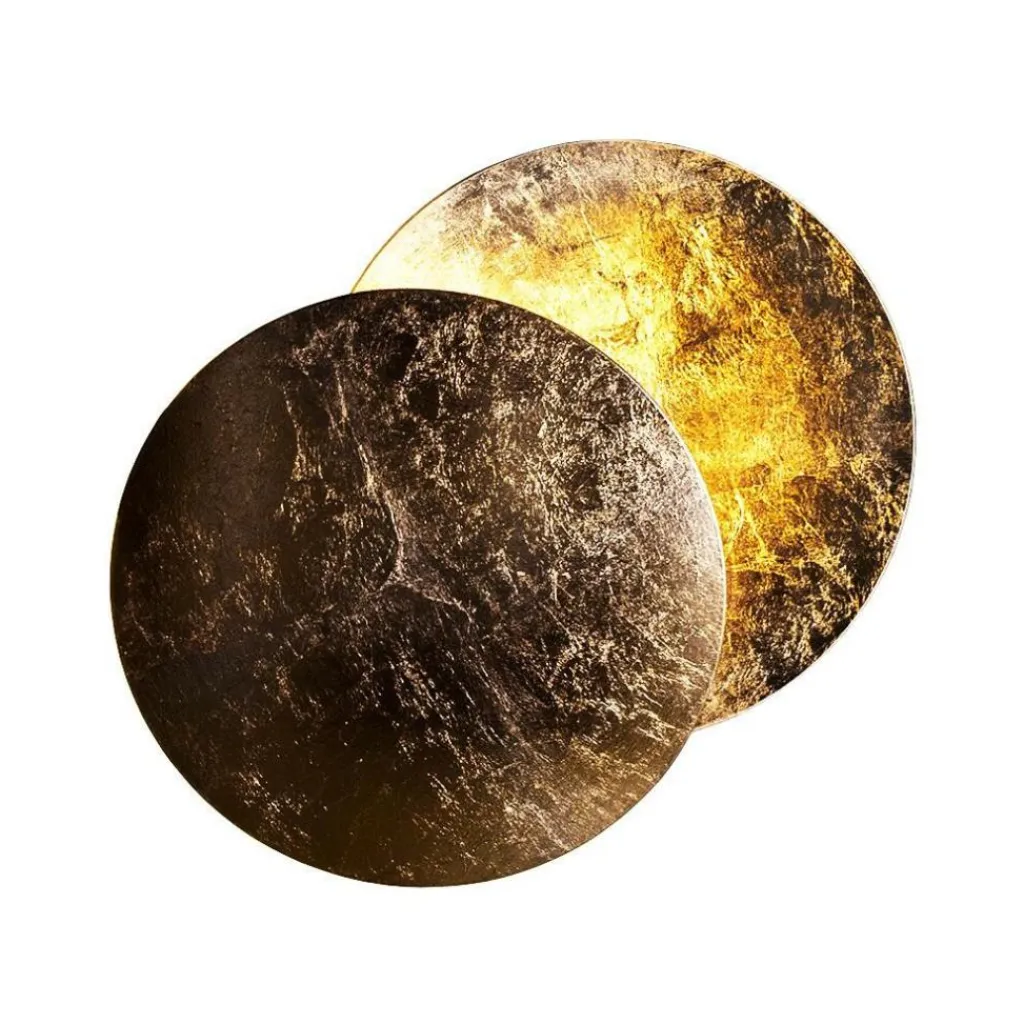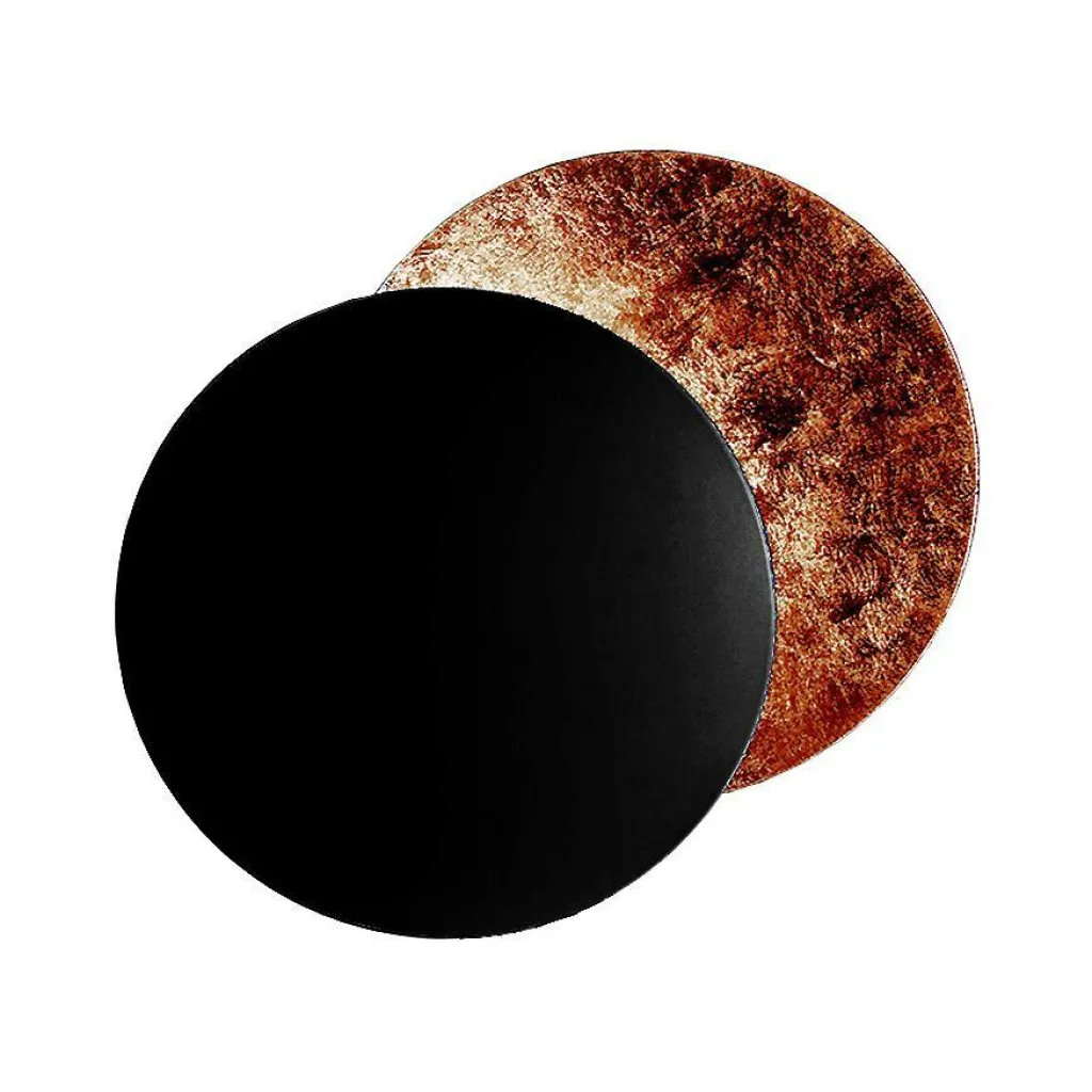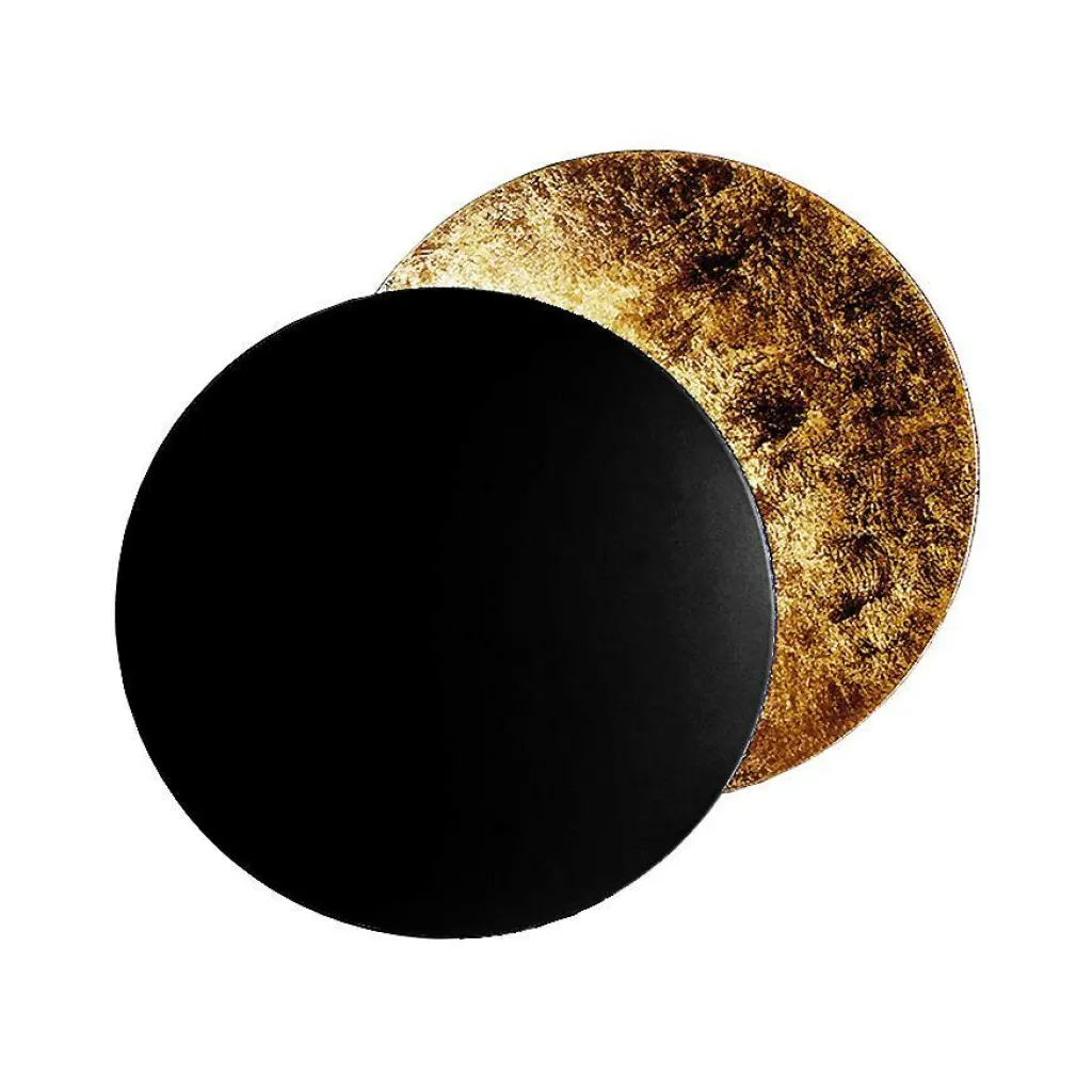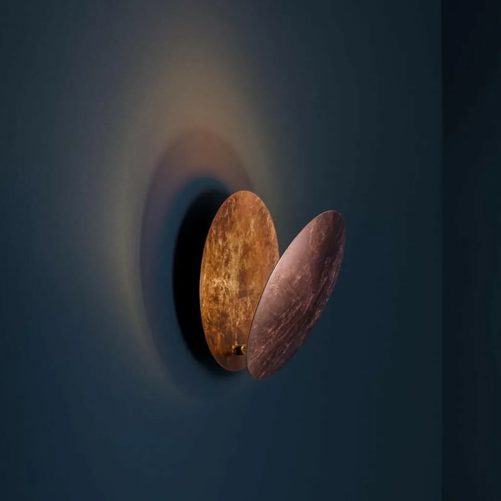 Die Lederam W 17 LED Wandleuchte wurde von dem italienischen Designer Enzo Catellani für den Hersteller Catellani & Smith entworfen. Die Lederam W 17 Wandleuchte besteht aus zwei gegenüberliegenden Scheiben aus Aluminium und Nickel, die beide einen Durchmesser von 17 cm haben. Auf der Innenseite der äußeren Scheibe ist ein LED-Modul angebracht, durch das die Außenseite der inneren Scheibe angestrahlt wird. Die beiden Scheiben sind durch ein bewegliches Scharnier miteinander verbunden, so dass die äußere Scheibe abgeklappt oder seitlich verschoben werden kann. So ergeben sich interessante Lichtkreise auf der Wand, die an eine Sonnen- oder Mondfinsternis erinnern. Die Lederam W 17 Wandleuchte ist mit einem weißen oder schwarzen Gestell erhältlich, das an der Wand befestigt wird und einen Durchmesser von 7 cm hat. Bei den Scheiben hat man die Wahl zwischen zwei Scheiben in Gold oder Kupfer oder einer inneren Scheibe in Gold oder Kupfer, die den Lichtschein widerspiegeln, und einer äußeren schwarzen Scheibe.