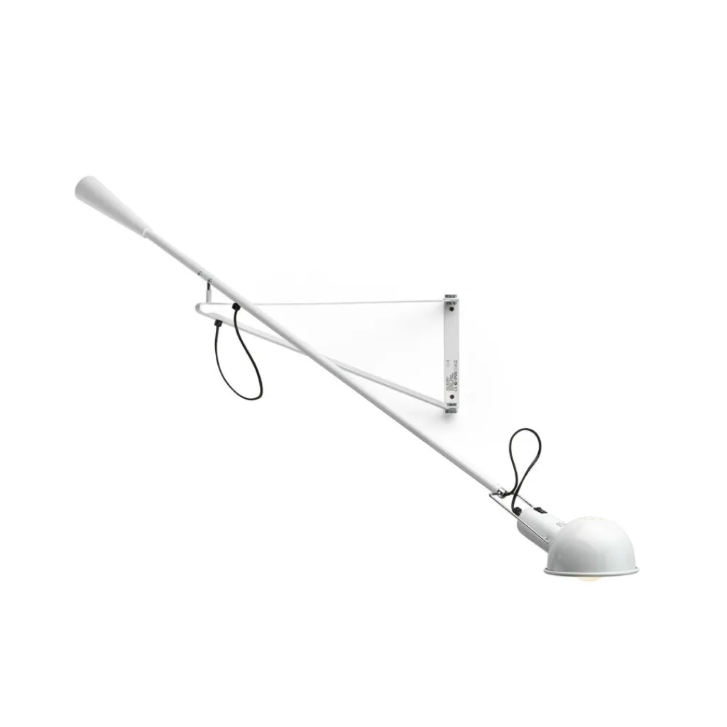 Die 265 Wandleuchte S eignet sich dank ihres minimalistischen Stils hervorragend für moderne Wohnräume. Sie kann an der Wand im Homeoffice, im Büro oder im Wohnraum befestigt werden. Der dreieckige Arm ist das Markenzeichen des Entwurfs. Er besteht aus flüssiglackiertem Stahl. Der Reflektor ist aus demselben Material gefertigt. Die Halterung des Reflektors wird aus verchromtem Messing gemacht. Der Leuchtenkopf sitzt auf einem beweglichen Arm. An seinem Ende ist ein Gegengewicht aus Gusseisen befestigt, das die Form eines Kegels hat und den Arm an der gewünschten Position hält. Der Leuchtenkopf ist schwenkbar. So hat die 265 Wandleuchte S eine beeindruckende Reichweite. Das Licht wird durch den halbrunden Leuchtenschirm nach unten gelenkt. In die Oberseite des Leuchtenkopfs sind Löcher eingearbeitet. Auch daraus dringt ein wenig Licht heraus.