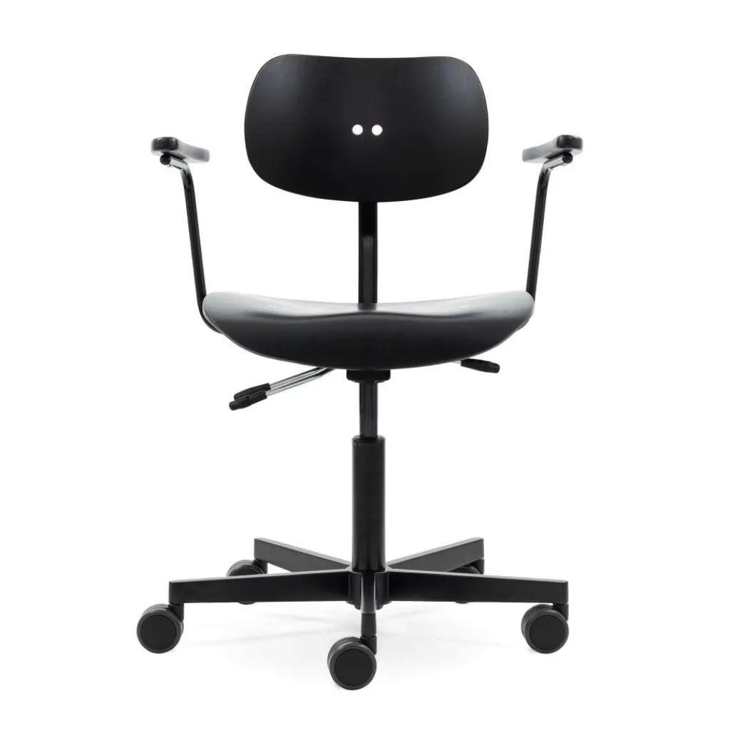 Der S 197 R 20 Drehstuhl mit Armlehne Gestell Schwarz fügt sich perfekt in das moderne Arbeitsleben ein, wo Flexibilität gefragt ist. Die innovative Neigemechanik sorgt dafür, dass Sitzfläche und Rückenlehne jeder Bewegung folgen. Daher ist das Sitzgefühl auch nach Stunden ausgezeichnet. Der Drehstuhl hat ein Gestell, das aus lackiertem Aluminium besteht. An der Unterseite des 5-Stern-Fußes sind Doppelrollen mit einem Durchmesser von 7cm montiert. Der Sitz ist ergonomisch geformt und besteht aus verleimtem Echtholzfurnier aus Buche. Das Material stammt aus nachhaltiger Forstwirtschaft und trägt daher das FSC®-Siegel.