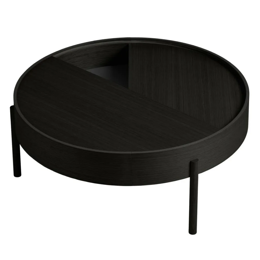 Mit einem Finger kann die Oberseite des Arc Couchtischs Ø 89cm gedreht werden. Die Öffnung in der Tischplatte führt zum Stauraum darunter. Darin können die Fernbedienung, Zeitungen, Bücher und viele weitere Utensilien abgelegt werden. Durch das von außen kaum wahrnehmbare Fach sorgt der Arc Couchtisch Ø 89cm für Ordnung in jedem Raum. Er macht neben der Sofalandschaft eine ebenso gute Figur wie in einem Büro oder in einem Wartezimmer.