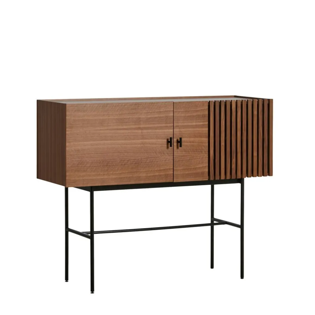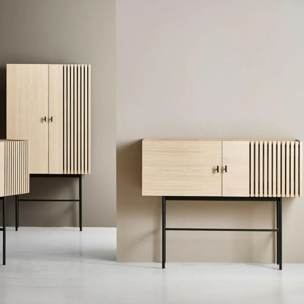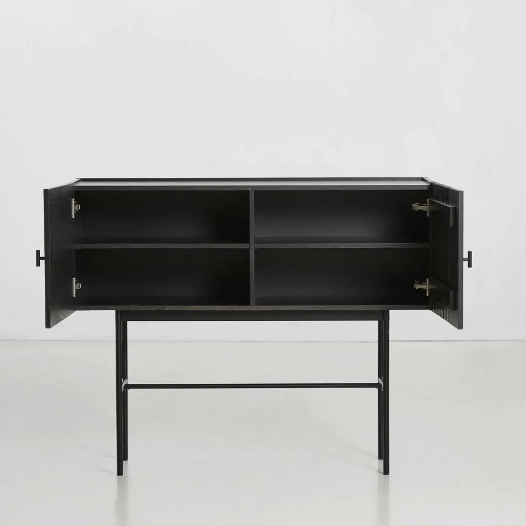 Der Aufbau des Array Sideboard 120cm ist denkbar einfach: Es thront auf einem Gestell aus dünnem Metallrohr. Vier schlanke Beine garantieren dem Sideboard sicheren Stand. Auf dem Rahmen thront der Korpus des Sideboards, das aus hochwertigem pigmentiertem Eichenholz gefertigt wurde und zwei Regalböden beinhaltet. An der rechten Seite schmücken horizontale Schlitze die Front. Die Inspiration für dieses Design fand Says Who in den Holzschieferverkleidungen zeitgenössischer Gebäude. Das Muster verleiht dem Array Sideboard 120cm einen dreidimensionalen Effekt. Die beiden Griffe bestehen aus schwarz lackiertem Metall. Mit seinem für den skandinavischen Stil typischen schlichten Entwurf harmoniert das Möbelstück mit jedem Einrichtungsstil.