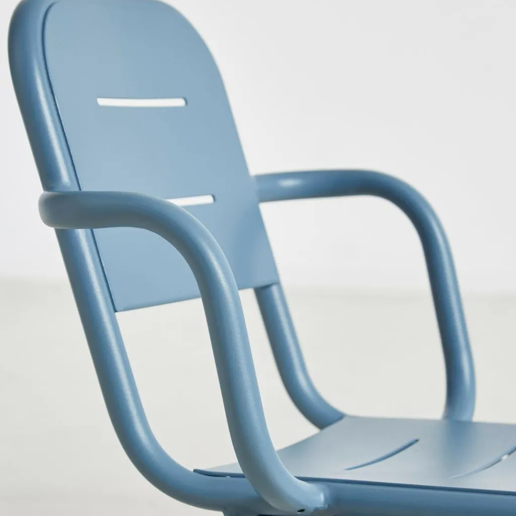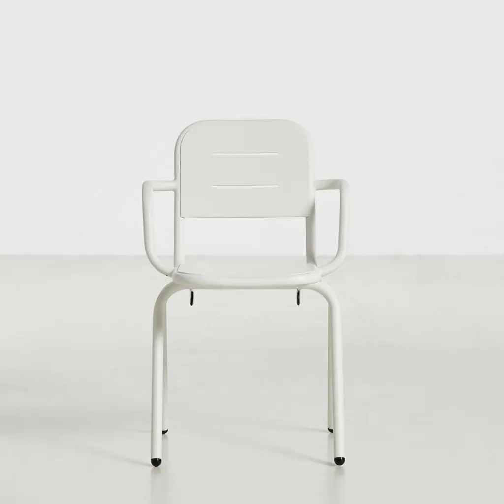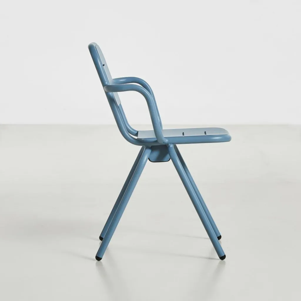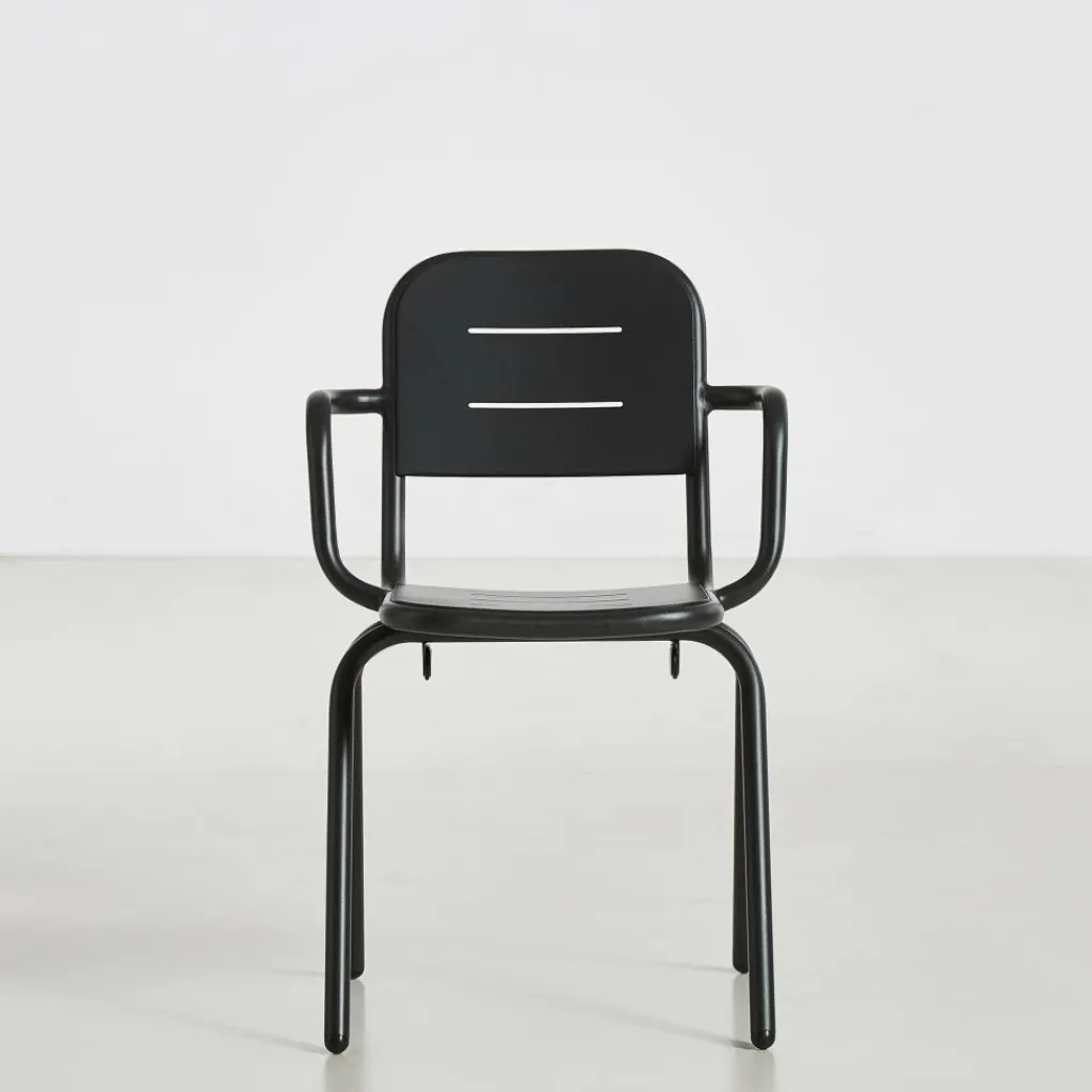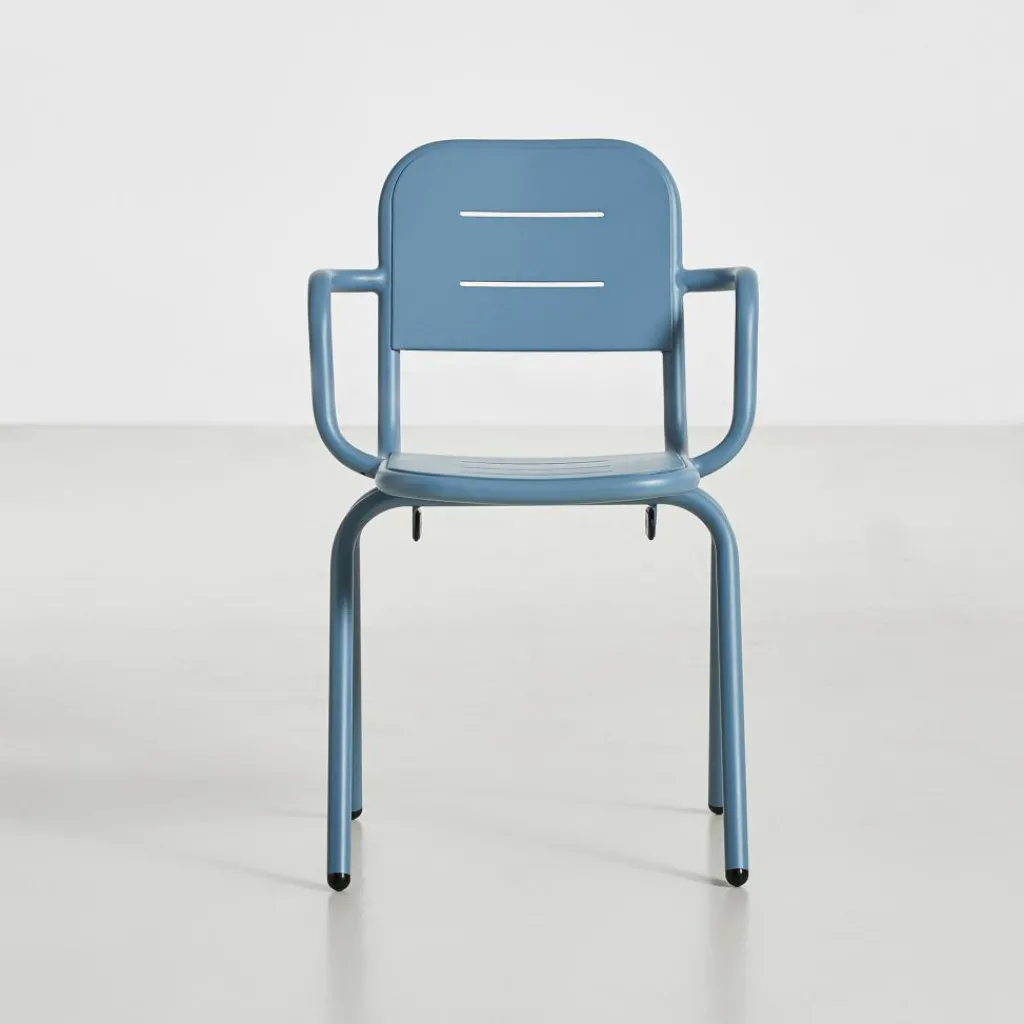 Der Ray Gartenarmlehnstuhl reduziert sich auf schlichte geometrische Formen. Die vier Stuhlbeine verjüngen sich nach oben hin. Einen interessanten Kontrast dazu bilden die rund geformten Armlehnen, die über die gesamt Sitzfläche gehen. Die Kanten der Sitzfläche und Rückenlehne sind ebenfalls abgerundet. Sie sind mit Spalten versehen, durch die Regenwasser im Nu abfließen kann. Wenn die Sonne durchscheint, entstehen interessante Muster am Boden. Hergestellt wird der Ray Gartenarmlehnstuhl aus pulverbeschichtetem Aluminium. Der Gartenstuhl eignet sich für diverse Einsatzbereiche und stellt eine bequeme Sitzgelegenheit dar. Er wird neben der Verwendung im Garten oder auf dem Balkon auch gerne im Freibereich eines Restaurants oder Cafés genutzt.