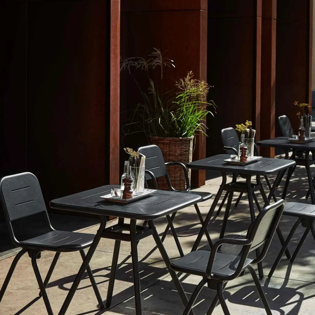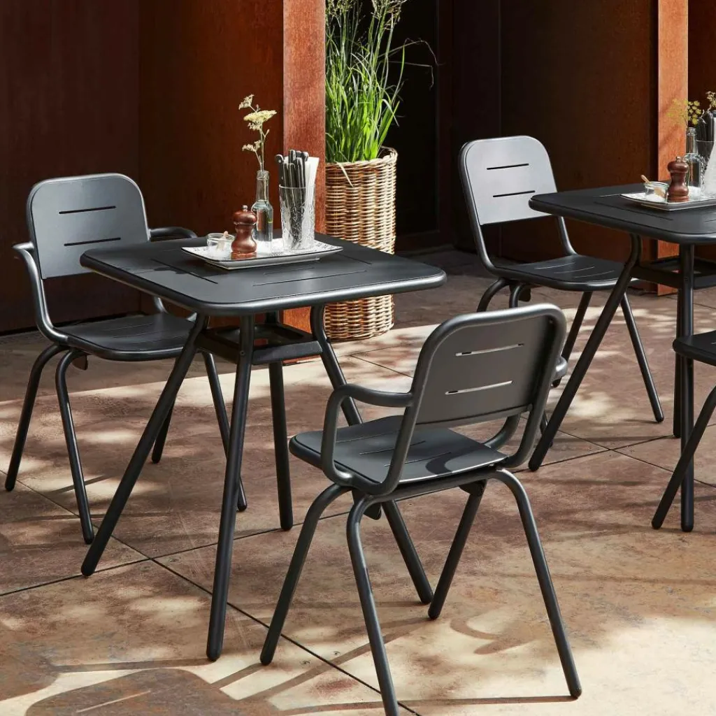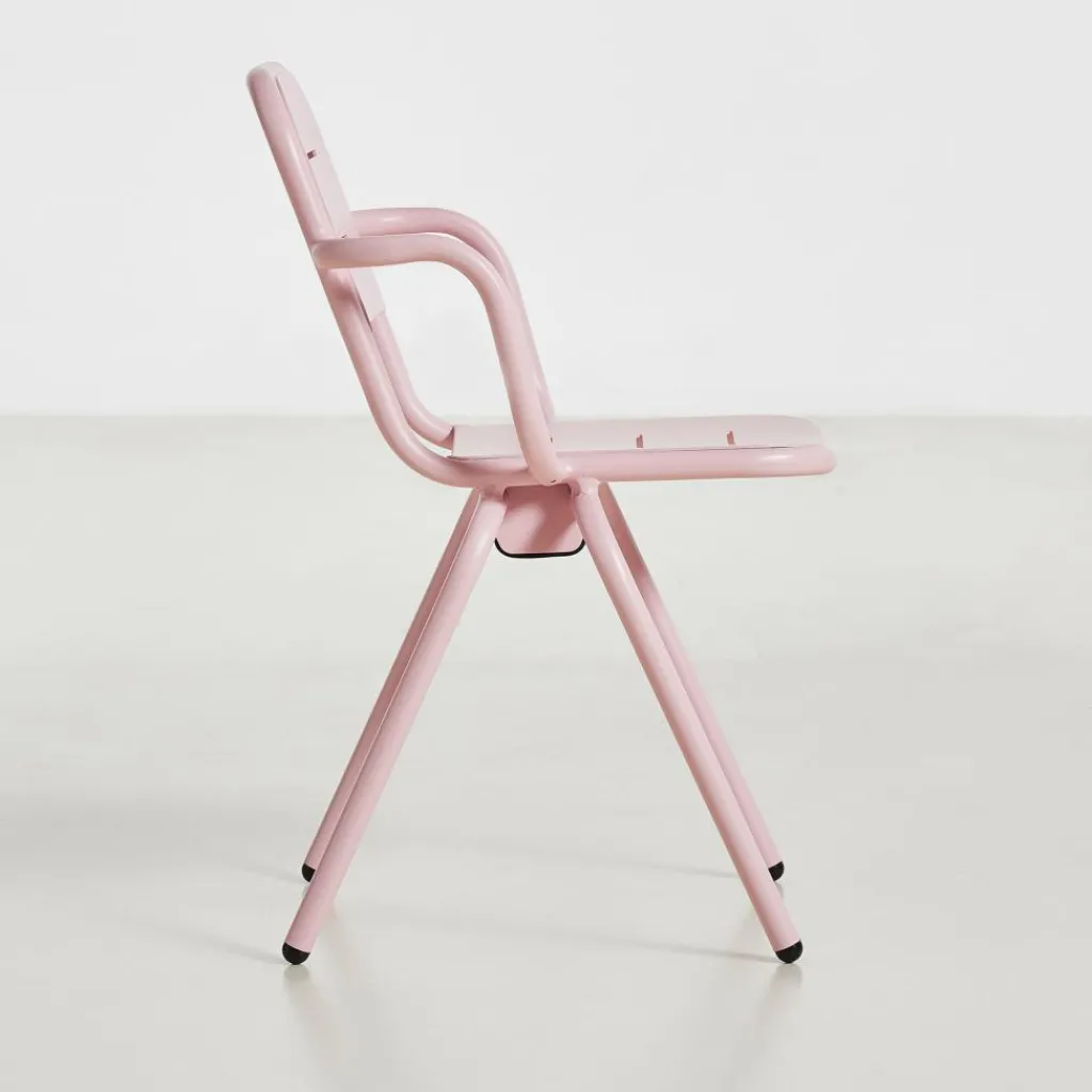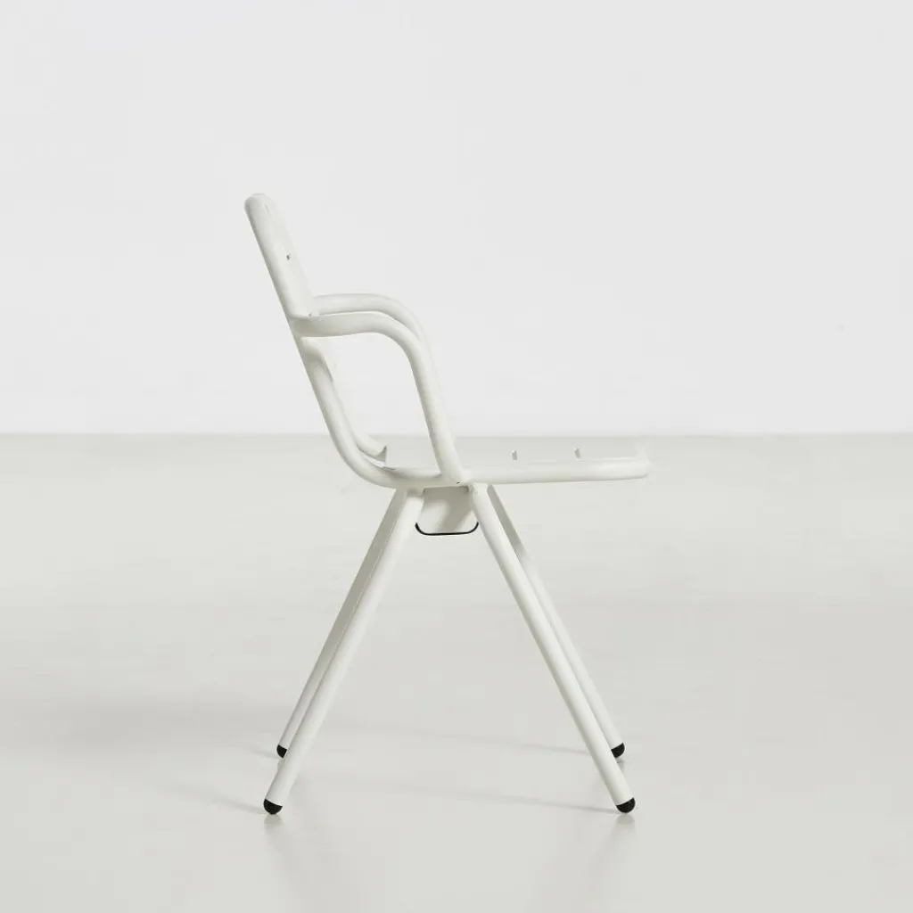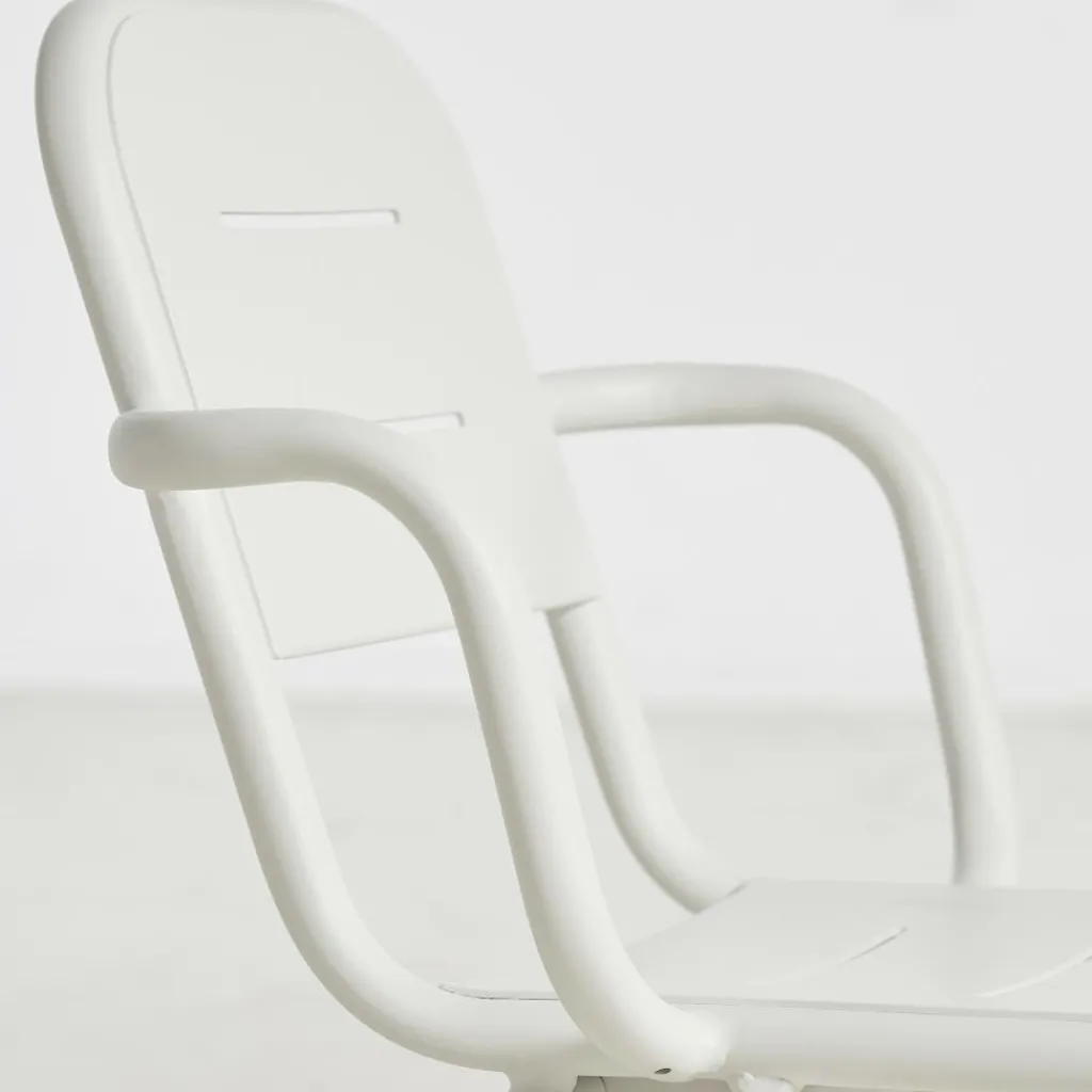 Der Ray Gartenarmlehnstuhl reduziert sich auf schlichte geometrische Formen. Die vier Stuhlbeine verjüngen sich nach oben hin. Einen interessanten Kontrast dazu bilden die rund geformten Armlehnen, die über die gesamt Sitzfläche gehen. Die Kanten der Sitzfläche und Rückenlehne sind ebenfalls abgerundet. Sie sind mit Spalten versehen, durch die Regenwasser im Nu abfließen kann. Wenn die Sonne durchscheint, entstehen interessante Muster am Boden. Hergestellt wird der Ray Gartenarmlehnstuhl aus pulverbeschichtetem Aluminium. Der Gartenstuhl eignet sich für diverse Einsatzbereiche und stellt eine bequeme Sitzgelegenheit dar. Er wird neben der Verwendung im Garten oder auf dem Balkon auch gerne im Freibereich eines Restaurants oder Cafés genutzt.