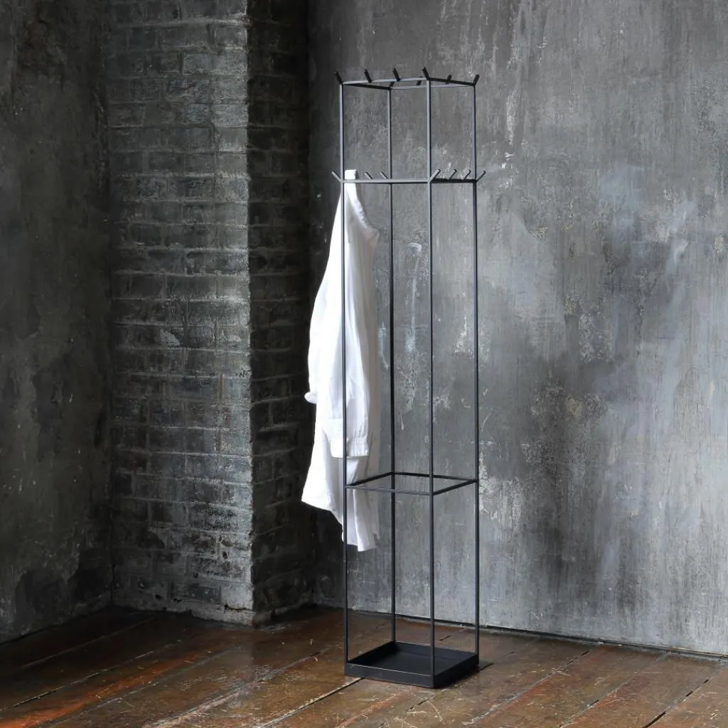 Ein filigranes Gitter bildet die Grundform dieses Aufbewahrungsmöbels. Es umspannt einen Kubus über einer quadratischen Fläche und kann wie eine Säule mitten im Raum stehen. So ist der Slim Irony Kleiderständer 34x34x169cm schon für sich allein gesehen ein dekoratives Designstück. Mit Kleidungsstücken auf den Haken behängt, verschwindet die Konstruktion dank ihrer zarten Stäbe fast völlig. Hergestellt aus robustem Vierkantstahlrohr und einer stabilisierenden Stahlblechplatte als Ablagefläche zeichnet sich das Garderobenmöbel durch eine hohe Belastbarkeit aus. Die Materialien stammen dabei großteils aus recycelten Stoffen, was den Slim Irony Kleiderständer 34x34x169cm zum nachhaltigen Produkt macht. Er passt in ein schickes Café, ins Vorzimmer einer Agentur, in eine Galerie sowie in den Flur.